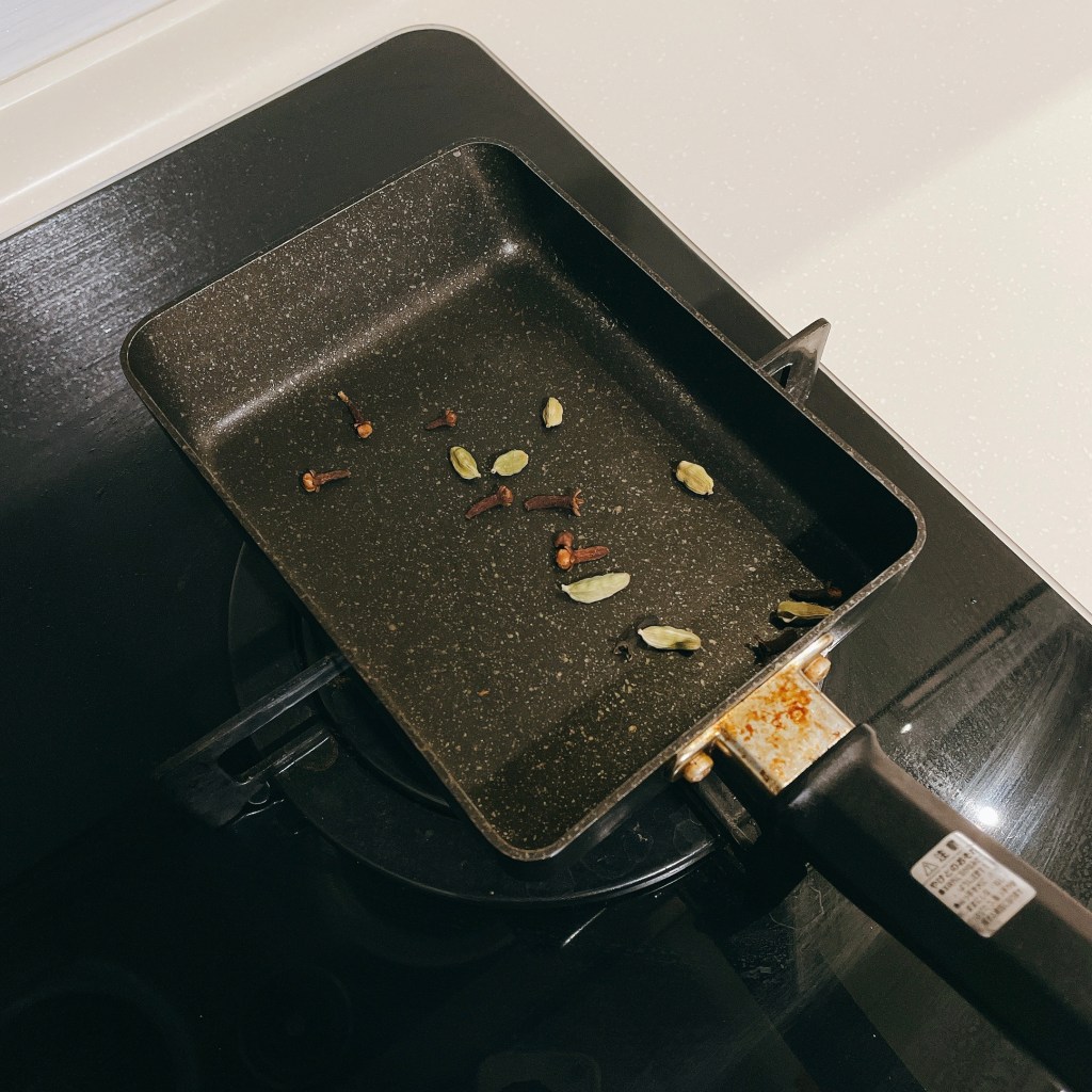 將綠豆蔻(1大匙)、丁香(1大匙)放入平底鍋中小火乾炒3分鐘,讓香料釋放味道。
