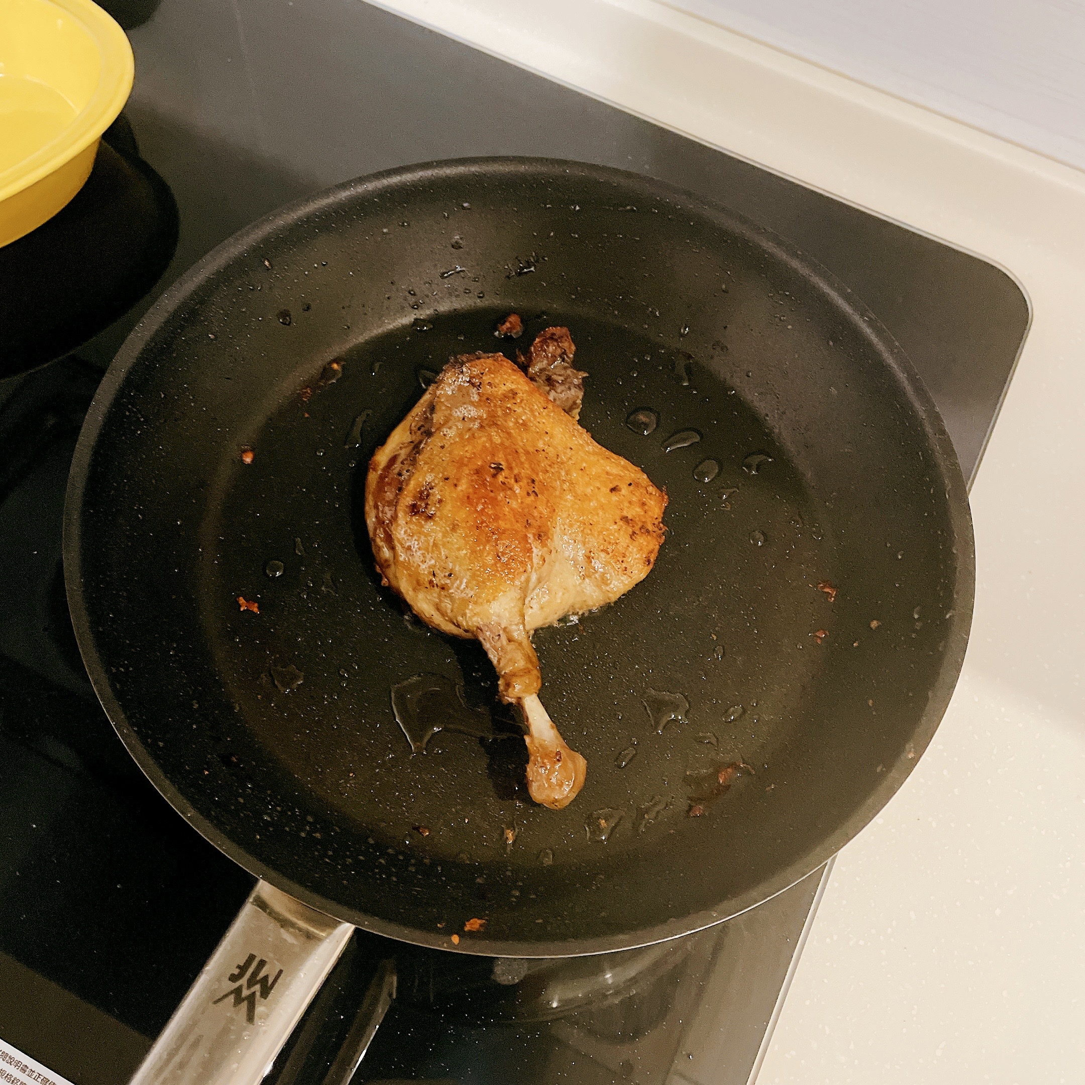 油封鴨腿解凍後,皮朝下放入平底鍋以中火煎3分鐘至金黃上色;翻面後亦煎3分鐘,外表酥脆、內部肉質軟嫩的油封鴨腿,完成!