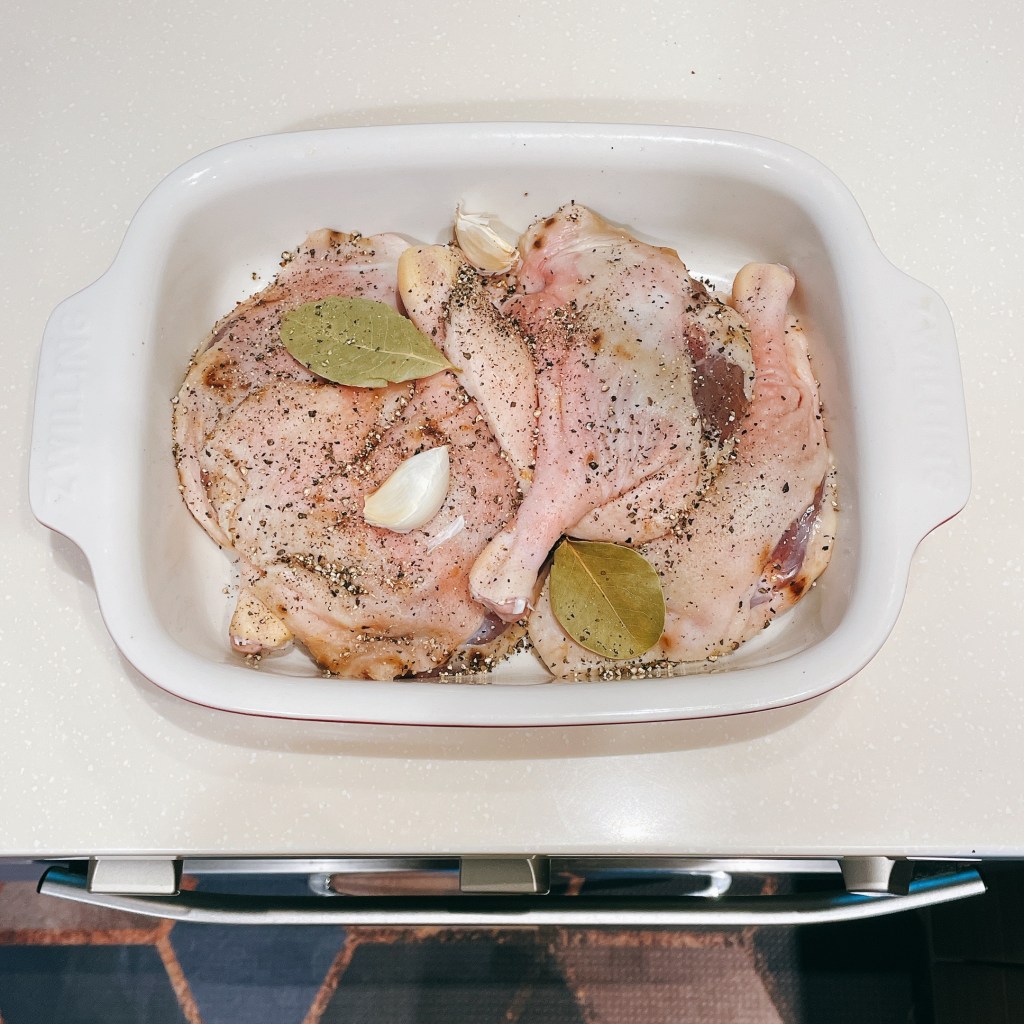 將擦乾的鴨腿(4隻)緊密堆疊放入具深度的烤盤後,加入月桂葉(2片)、帶皮大蒜(2瓣)和黑胡椒粒(1大匙),