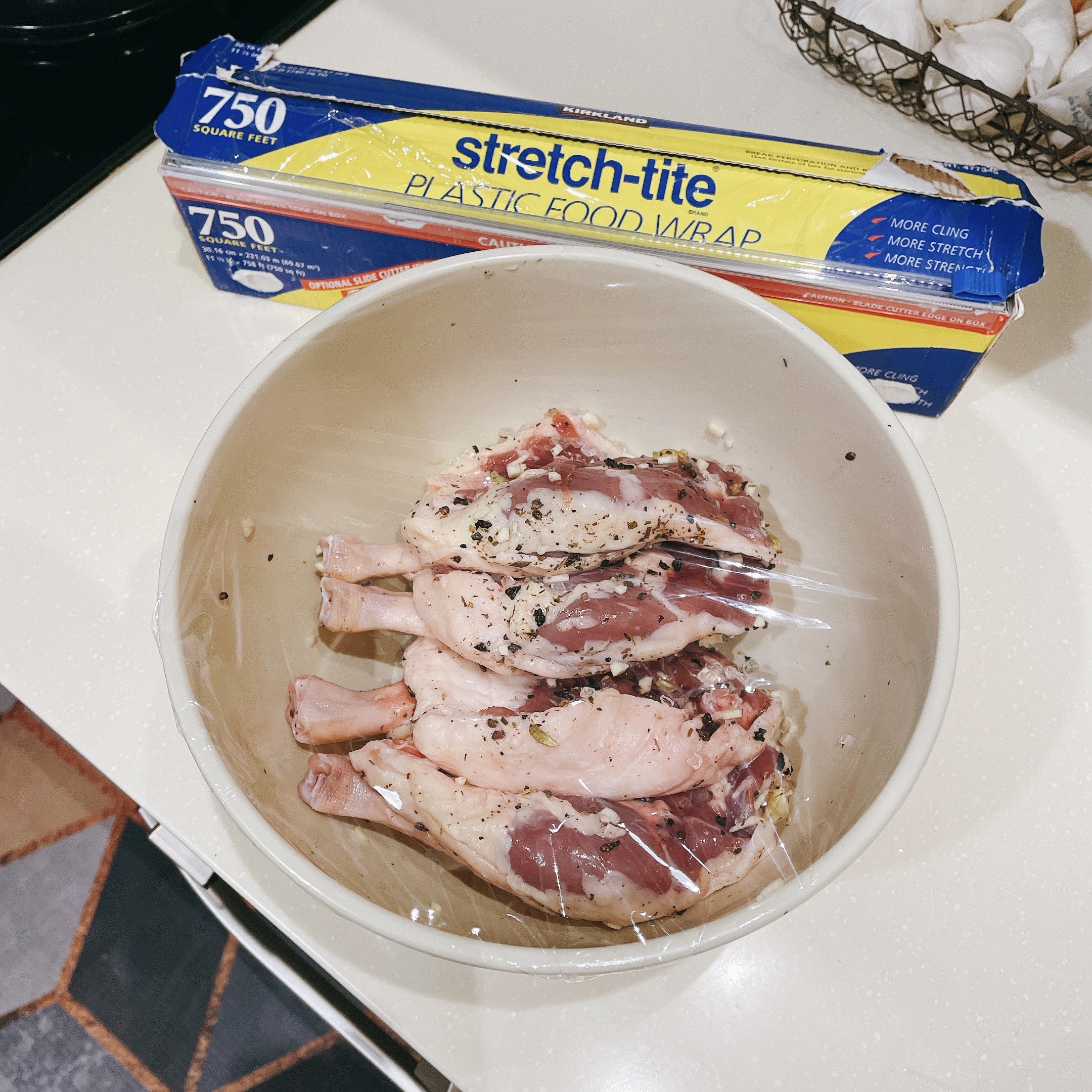 將大蒜(2瓣)剁碎與綜合乾香草(1茶匙)與鴨腿拌勻,用保鮮膜彌封後再蓋上蓋子放入冰箱醃漬保存3天。