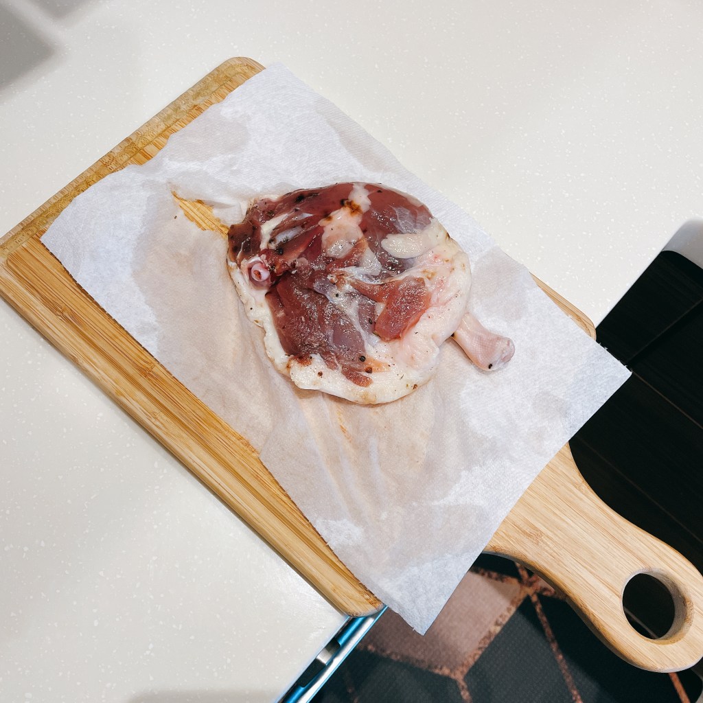 將完成醃漬的鴨腿用水洗乾淨、雙面以廚房紙巾擦乾