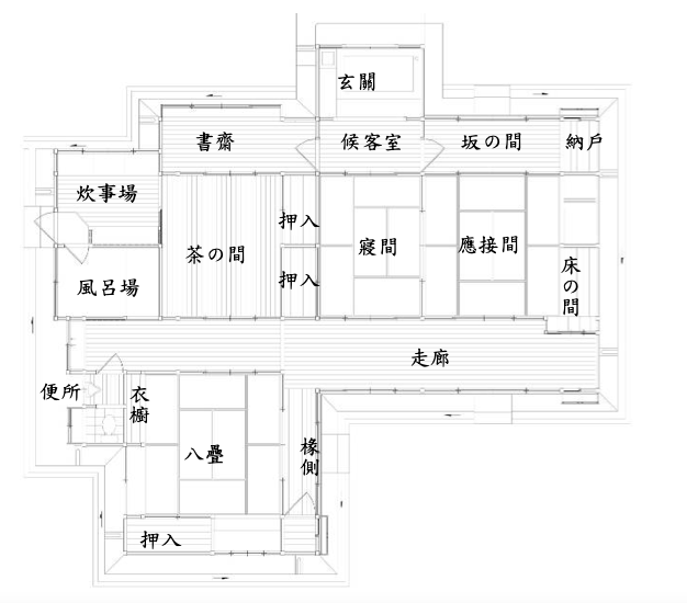 不同於傳統住宅注重儲藏空間與配置,廣闊的公共空間、大坪數廊下以及突出的寄棟小屋,其「公設比」高達34%,比起同時期規格雷同的官舍室內空間配置(大約6~10%)真的都把空間留給社交功能了!