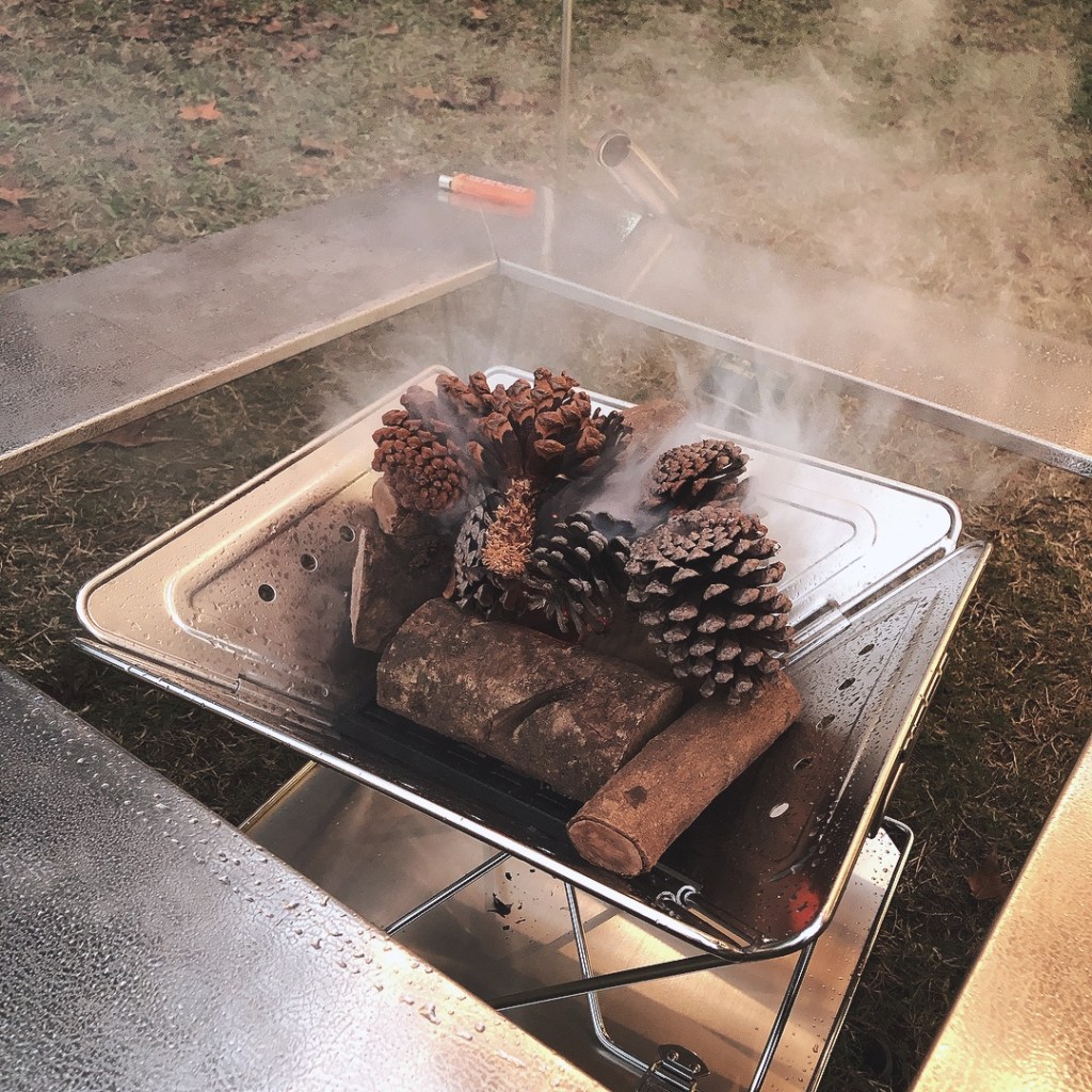 可依當下需求選擇適當大小的木材斜襬靠上並在空隙塞入幾顆松果,稍微用扇子搧幾下,就能輕鬆維持營火。