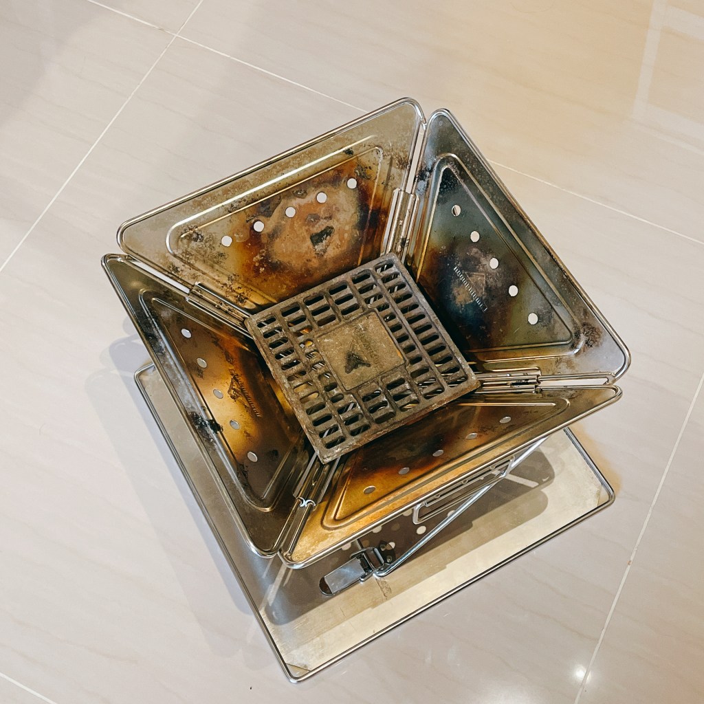 米飛通常等木柴自然燒盡,用夾子確認沒有火花灰燼後,將焚火台留在防火墊上過夜,隔天早上再將灰燼倒掉、稍微沖洗表面灰塵,裝回提袋裡等回到家後再好好清洗。