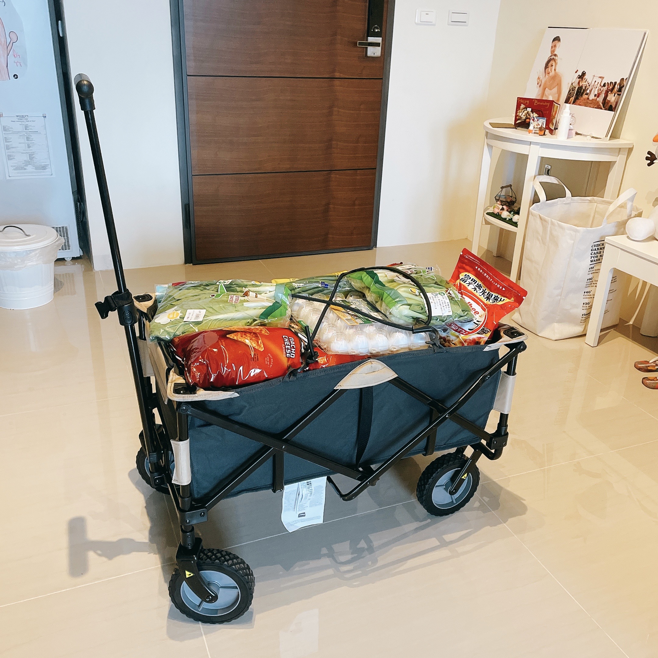 自備迪卡儂露營推車作為大型『購物袋』不但響應環保,也能降低病毒傳播風險,而且,運送過程真的輕鬆不費力,不用狼狽地把大包小包的馬鈴薯、冷凍蔬菜、麵粉和肉品等…扛回家裡。