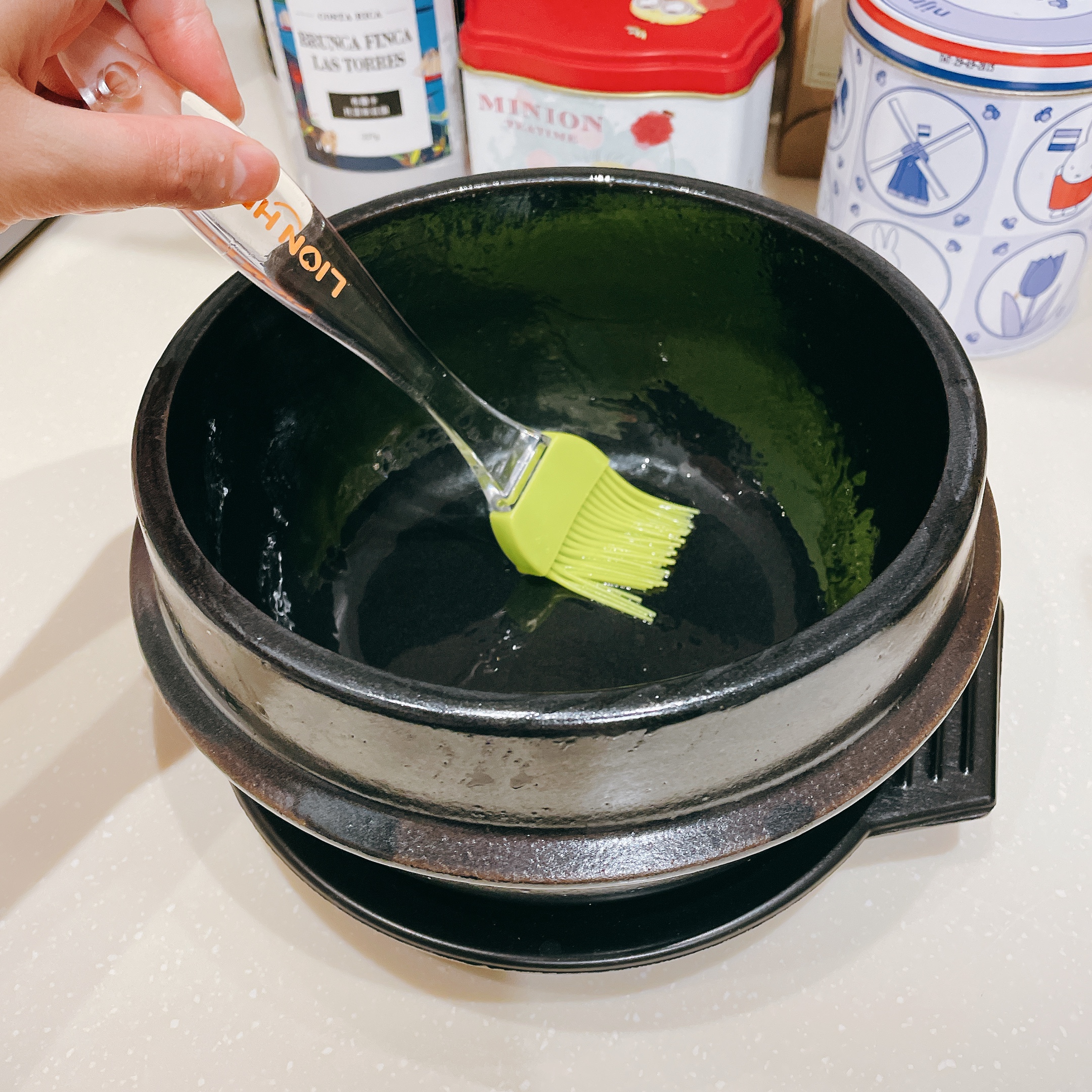 在陶鍋內加入橄欖油(1茶匙)以矽膠刷子完整塗抹陶鍋側源及底部,開小火加熱5分鐘再開始加入拌飯材料。