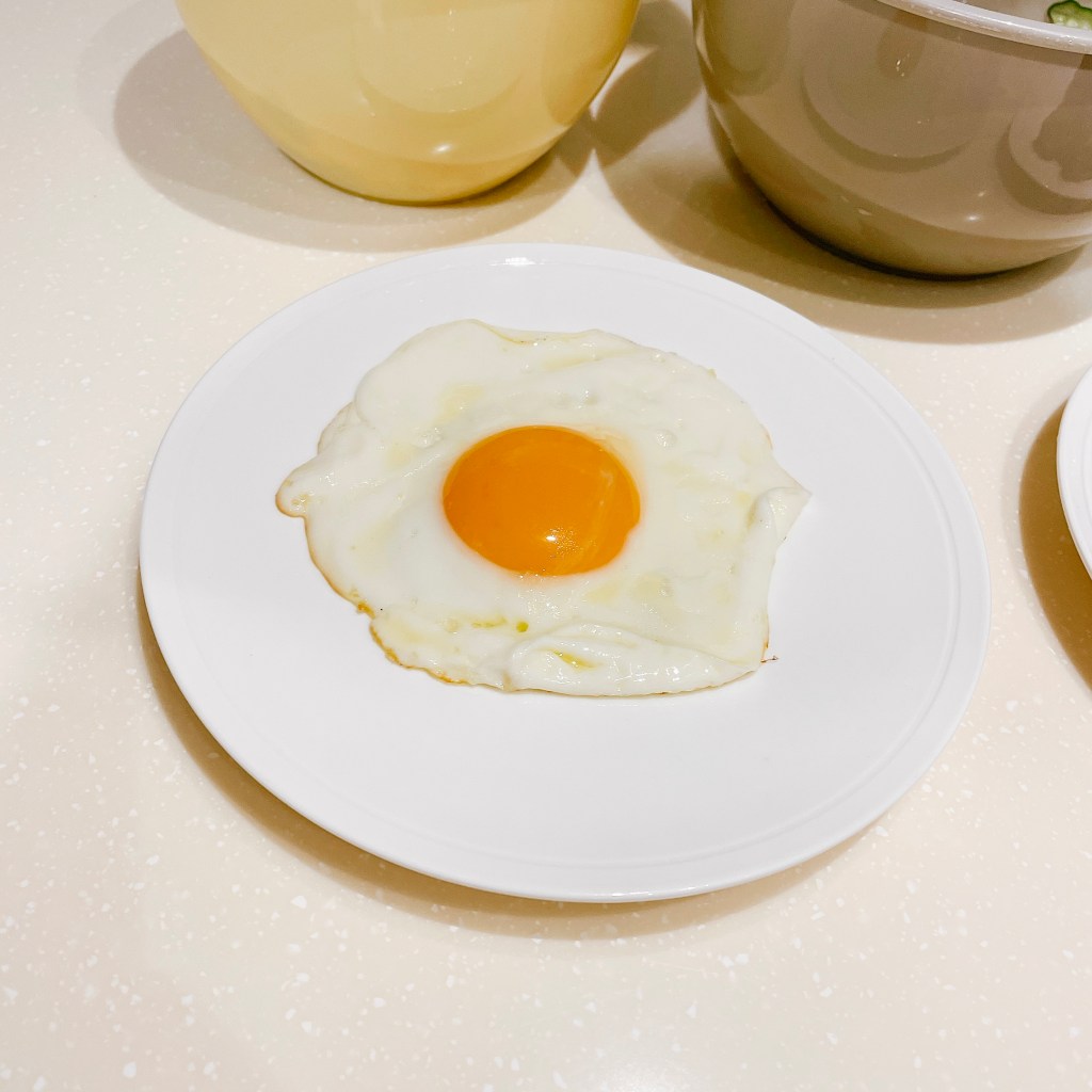 雞蛋小火煎1分鐘、再蓋鍋蓋悶煎30秒(或到蛋黃半熟)就能做出簡單又漂亮的太陽蛋囉!