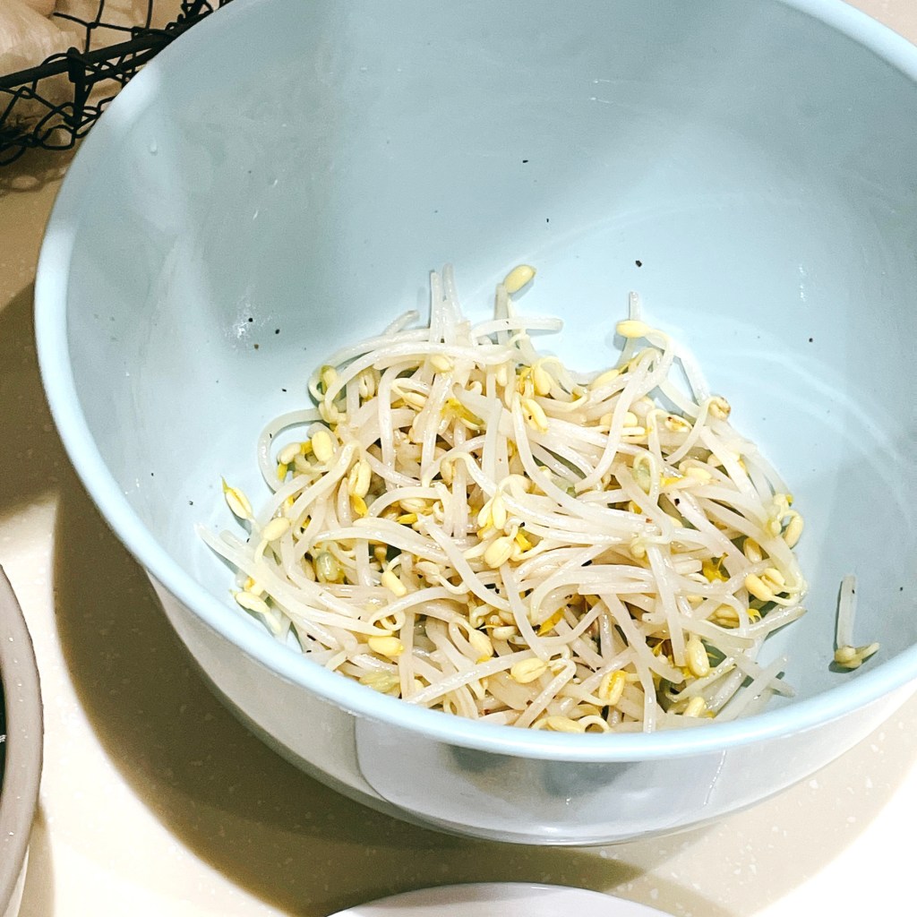 黃豆芽(100g)去除根部,用滾水川燙後,拌入鹽巴(1/2茶匙)、芝麻油(1/2茶匙)和黑胡椒(依個人口味適量),攪拌均勻後放涼備用。