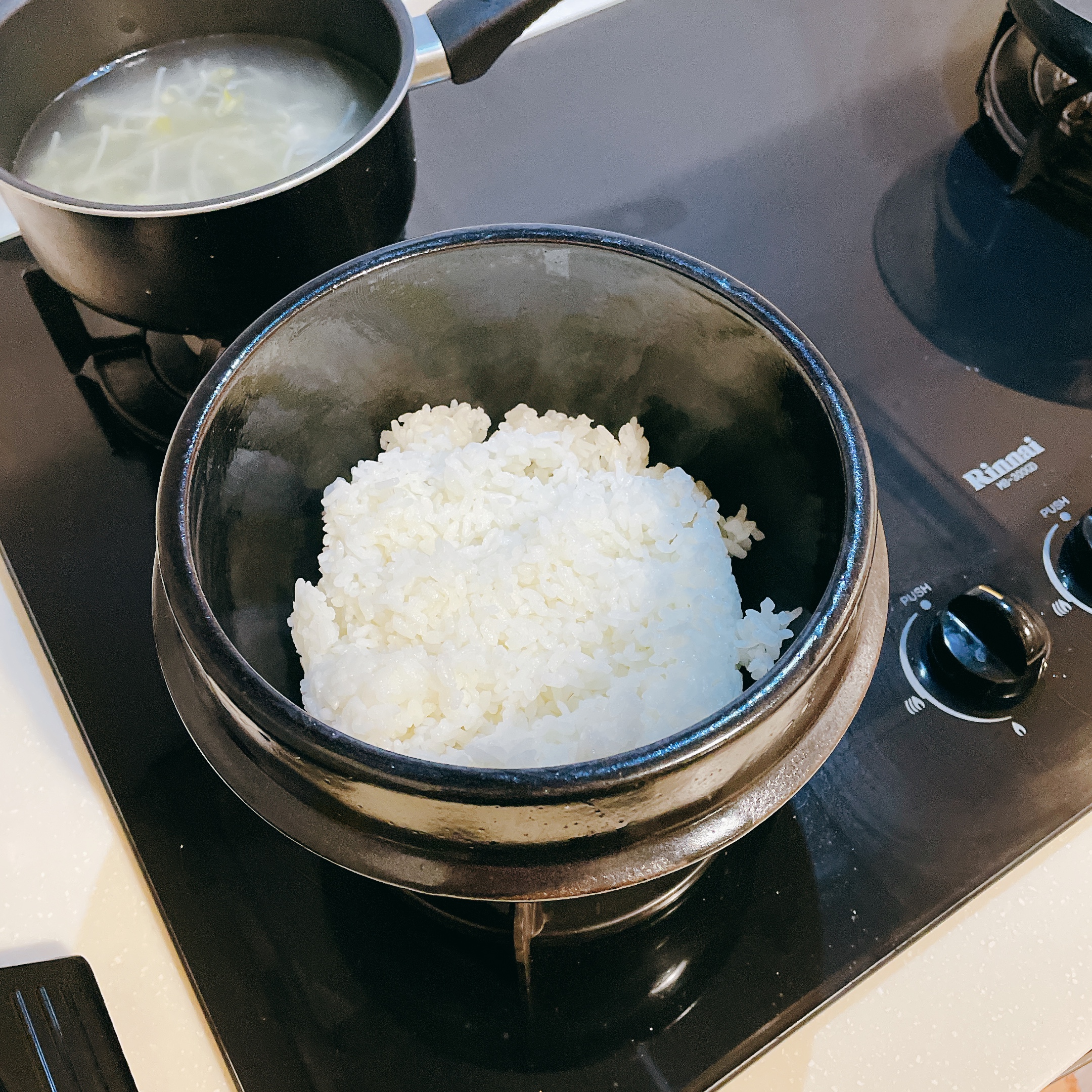 最後放上事先煎好的半熟太陽蛋,小火煮陶鍋直到聽到米飯和食材發出『霹哩啪拉』的聲音時,代表鍋底已產生鍋巴,就能關火上桌開飯啦!