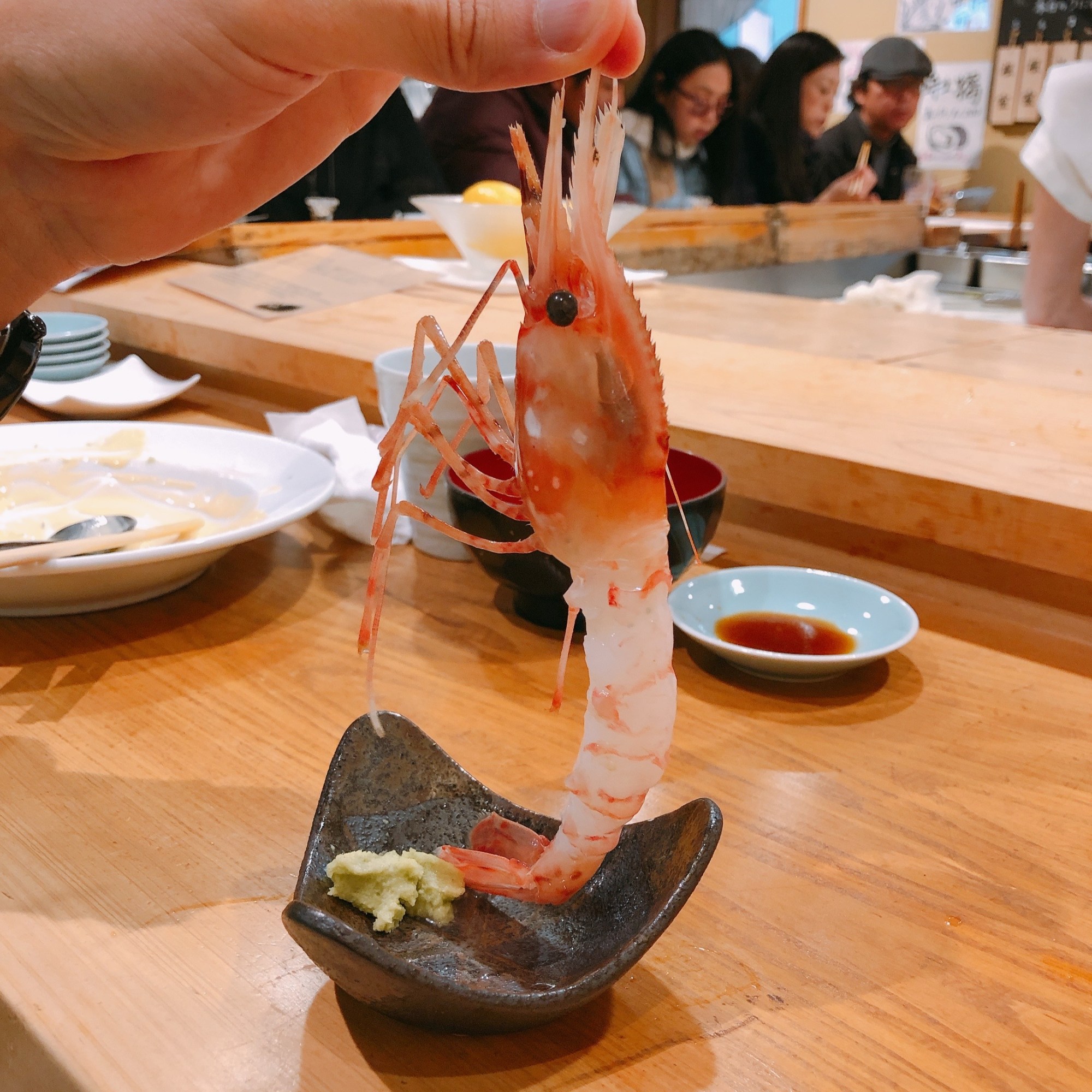 當天現捕的牡丹蝦,沾些許醬油和現磨芥末,鮮甜的蝦肉真的讓人魂牽夢縈。吃完蝦肉後,師傅還會協助烤蝦頭,火焰遇上甲殼的碳化香氣讓人口水直流,蝦頭的精華更顯濃郁,塞入米飯就完成絕妙的蝦頭飯糰。