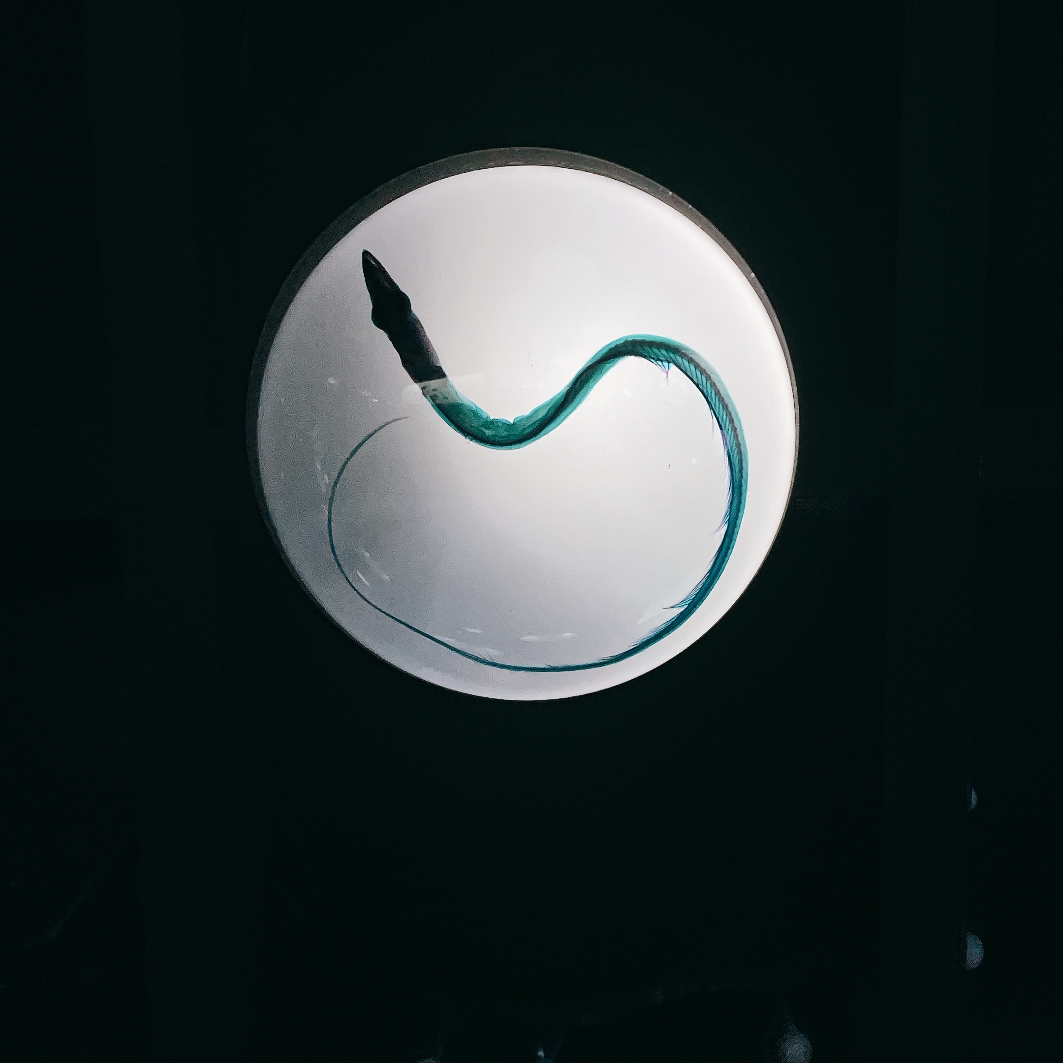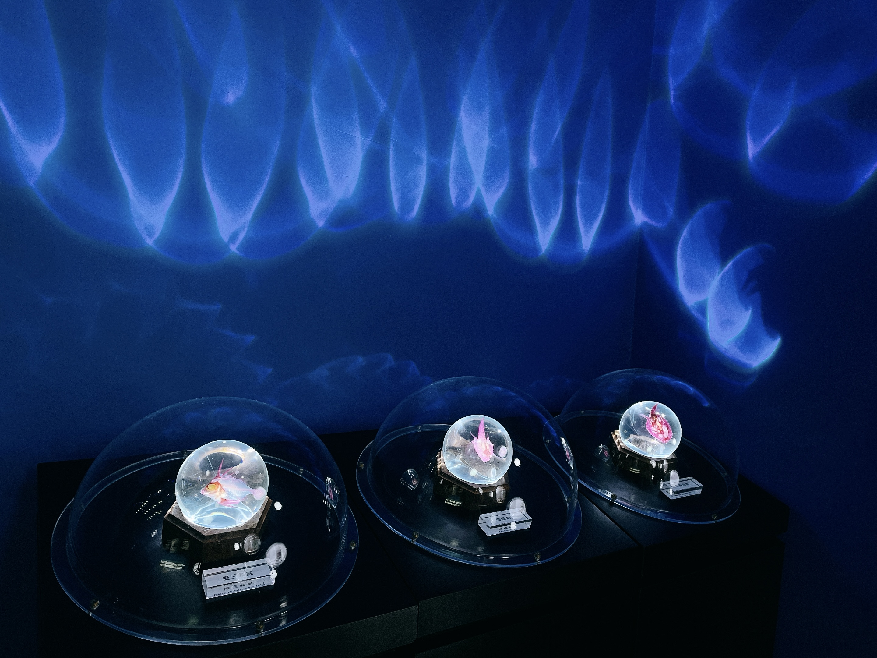 孤立於展區角落的漂亮標本,運用冷色調燈光造景創造唯美。吊掛在屋頂的銀盤好像藝術吸頂燈,比起科普教育意義,Xpark似乎將生物標本作為藝術展品。