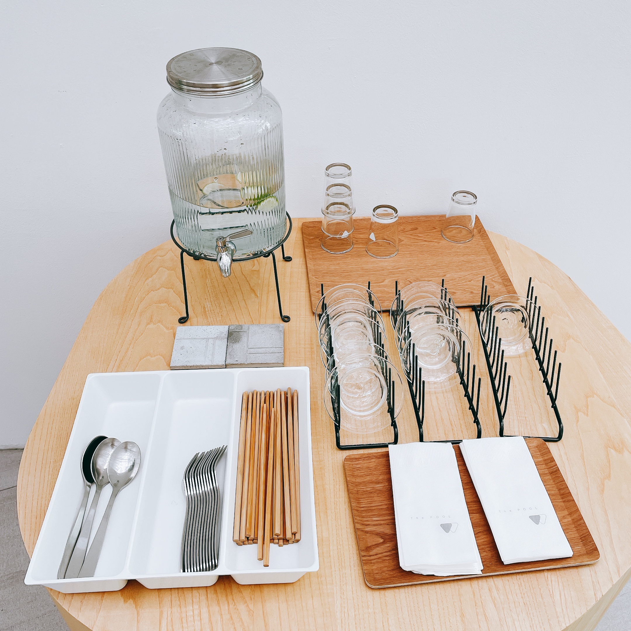 5樓整層內用區各角落都設有餐具和常溫檸檬水供使用,水杯當然是使用春池玻璃引以為豪的『143一口啤酒杯』讓客人裝飲用水。
