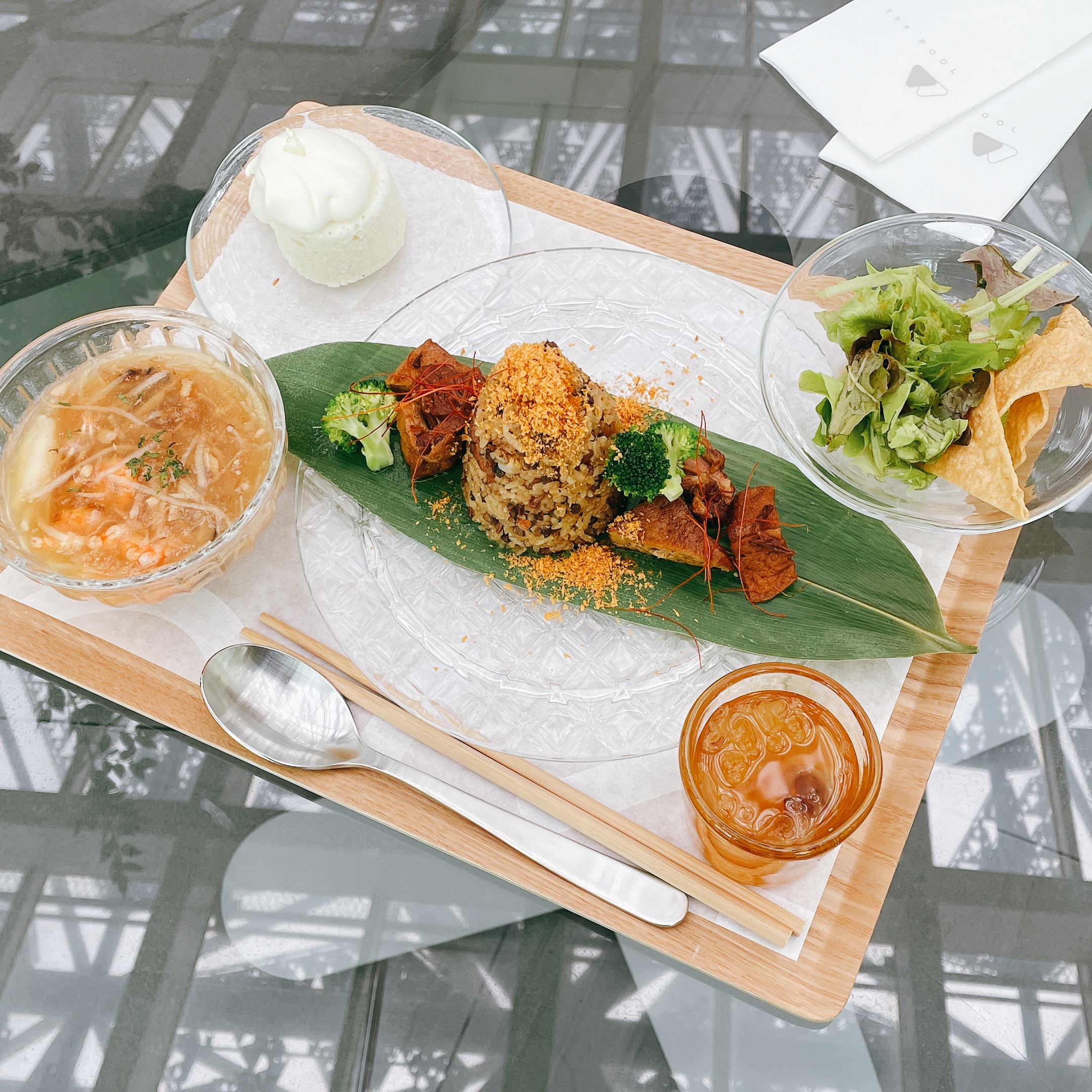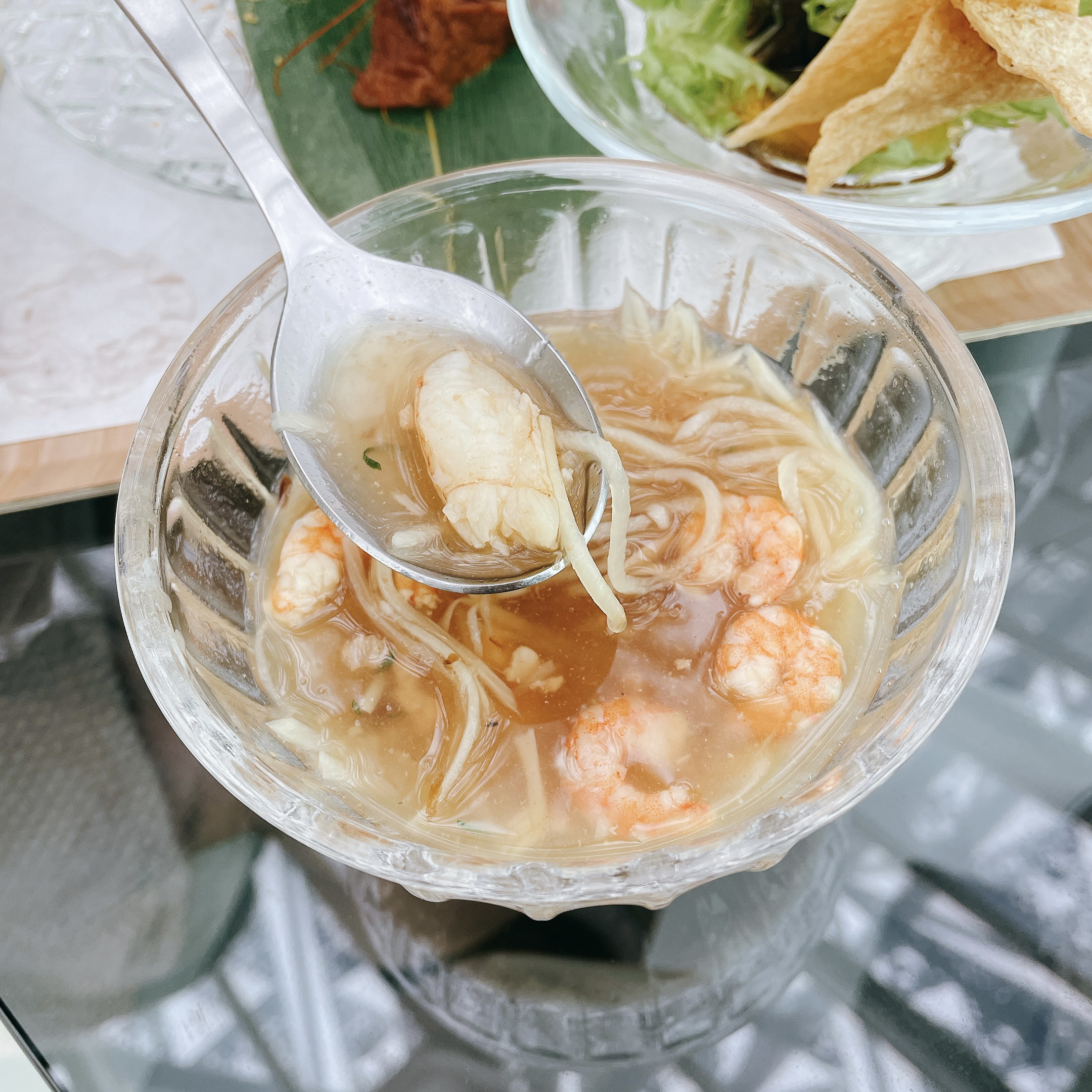 不同於傳統大盤紅蟳米糕呈現方式,南美春室以現代簡約擺盤設計,以妻物(月桂葉)和剔透玻璃碗盤重新組合阿霞經典米糕、啤酒滷肉/豆乾、蟹肉火蝦羹、蓮子銀耳甜湯。