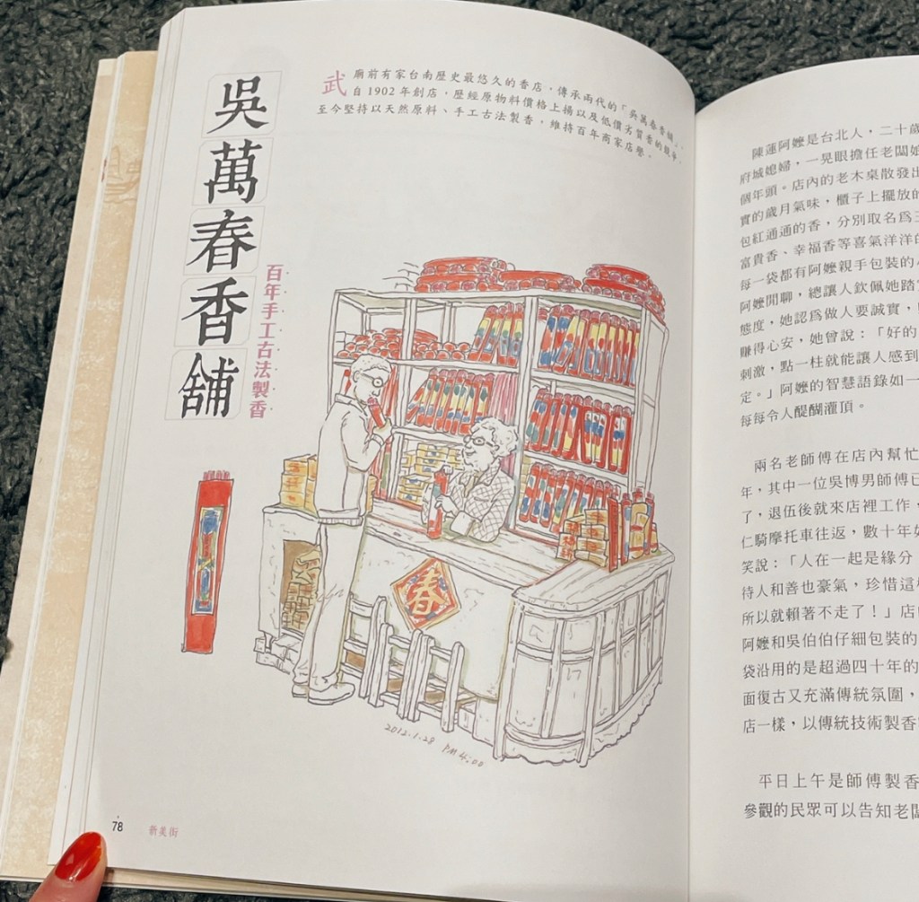 2014年出版的插畫在2022年的現在看來有股淡淡的惆悵;雖然書中的古董木桌與文中的阿嬤都不在了,【吳萬春香舖】經歷家族內部鬥爭、遷店、更名,但經典招牌「玉梅香」依舊以老派俏皮之姿守護香鋪。