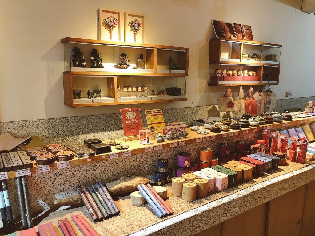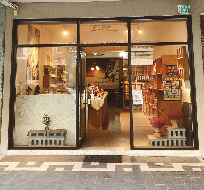 不同於廟埕周遭擺設的金紙攤商,台南百年老店【吳萬春香鋪】室內亮著溫暖的柔和燈光,店面落地窗樸質簡約,站在騎樓就能聞到香鋪舒服的藥材香氣。