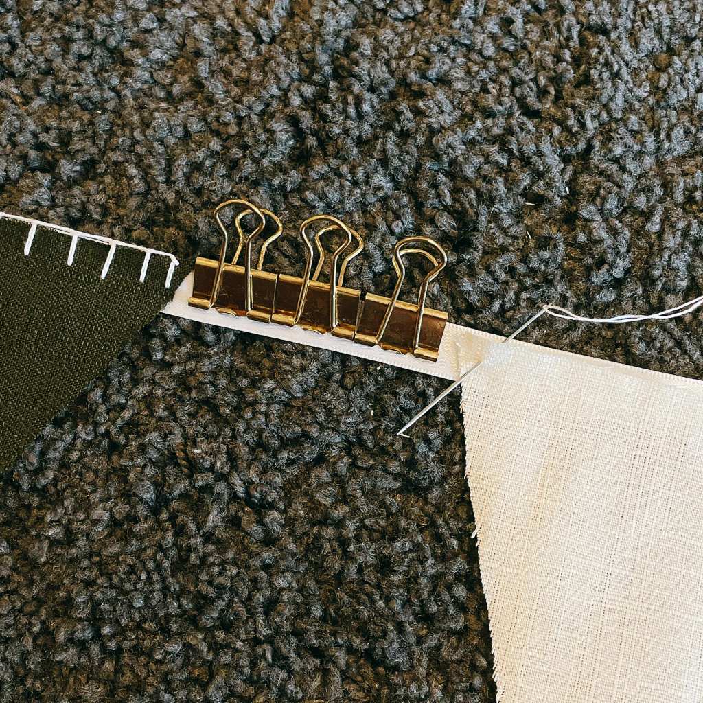 若要精準量測間距,不但需要尺而且十分麻煩,這時不如善用文具夾(3個)夾在兩面三角布旗中間作為間距,省時不費力又能讓手縫三角旗看起來整齊劃一!