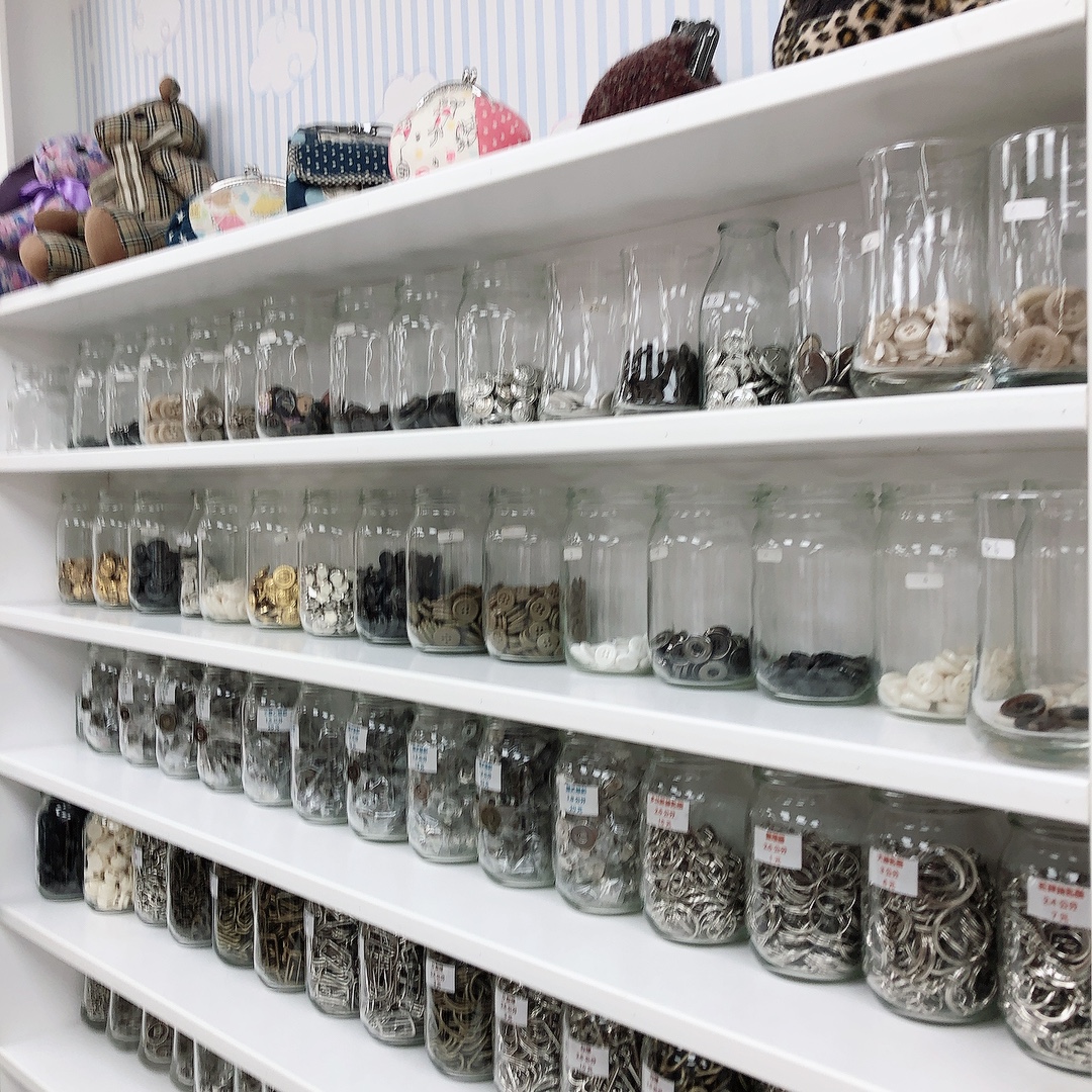 【清秀佳人布坊】整齊展示琳瑯滿目的布匹、價格標示清楚且販售手縫常見的各式鈕扣,此外,還有一區素面色階布可自行挑選。