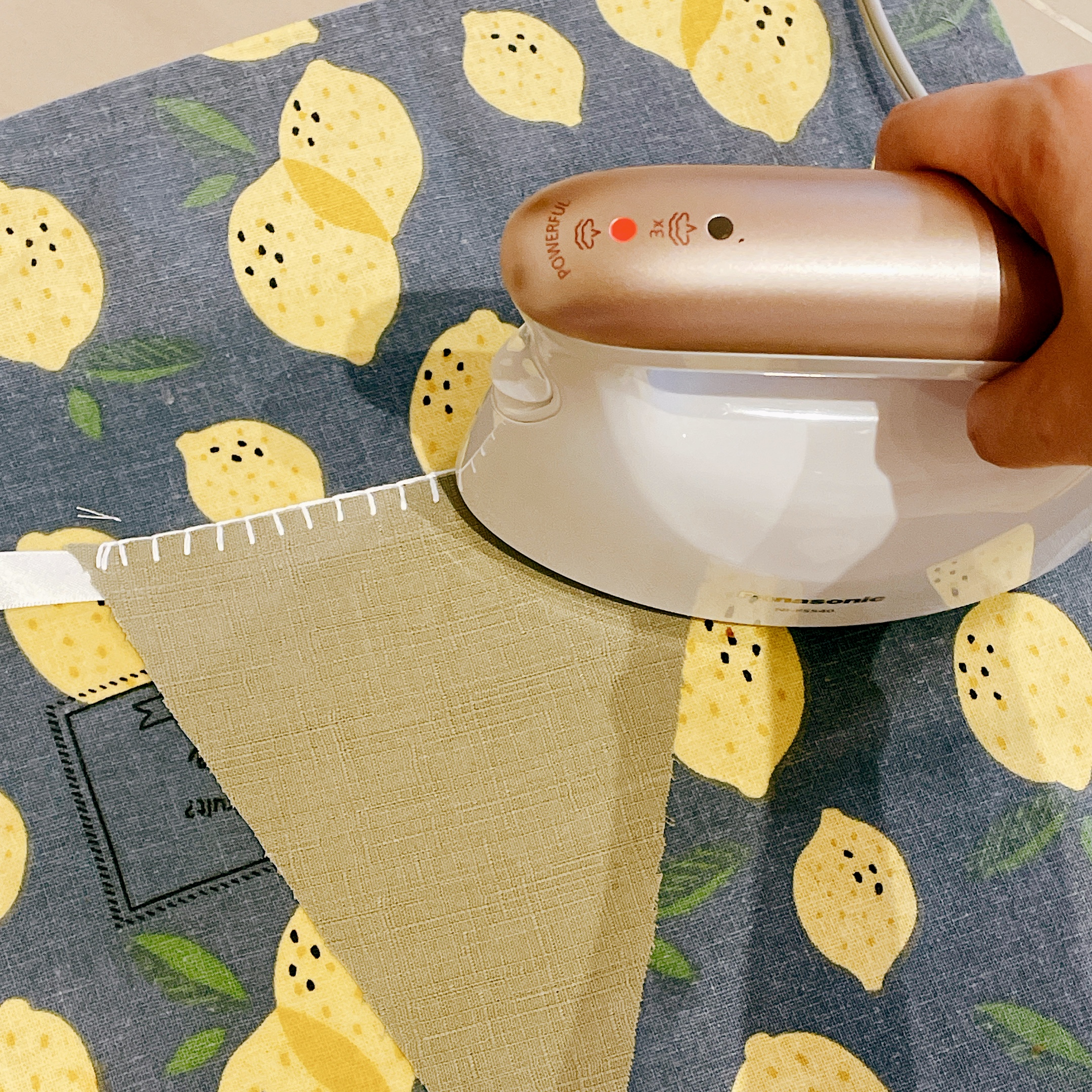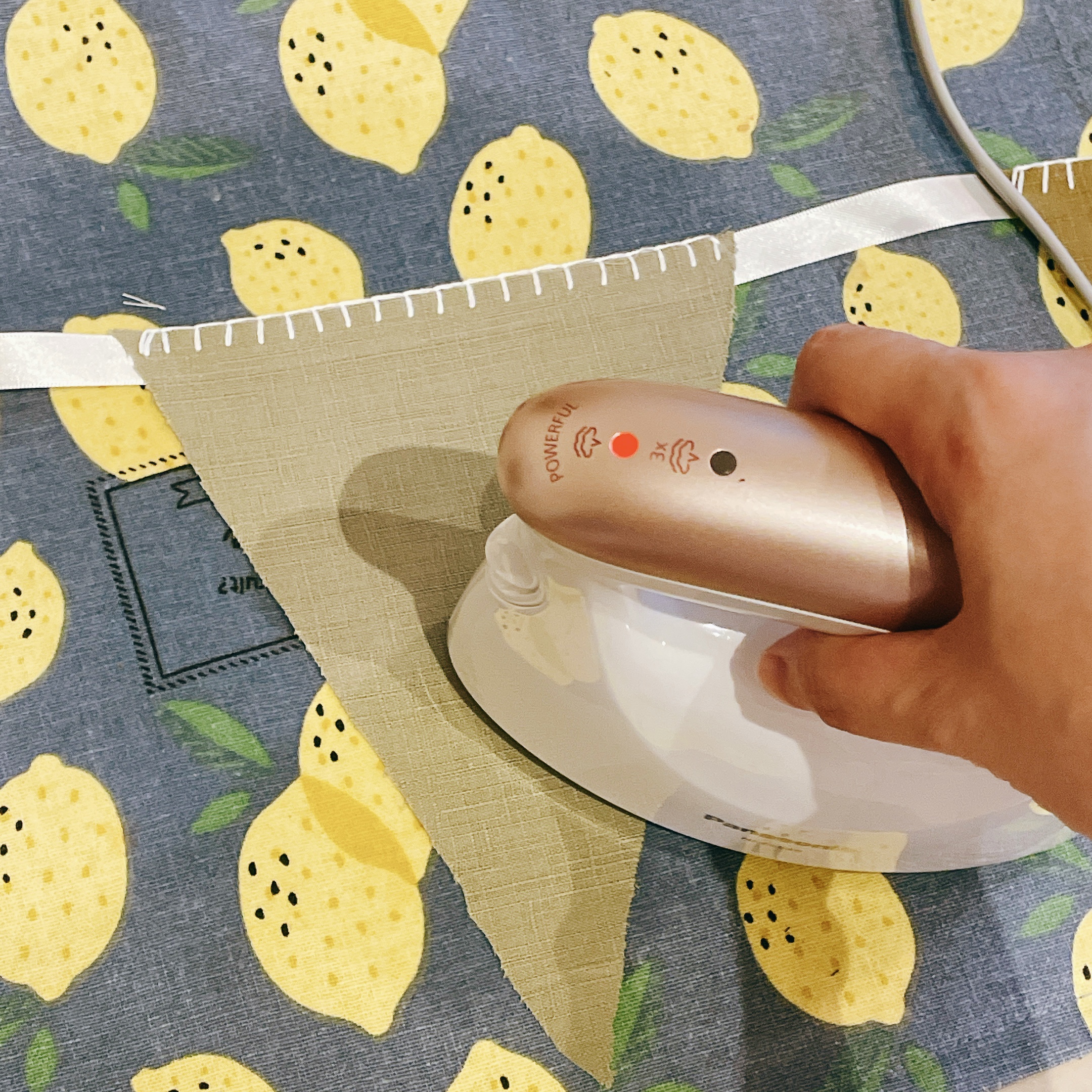 縫好後可使用蒸氣熨斗,燙過緞帶和縫線使之更加平整固定,順道燙平布面,就大功告成囉!