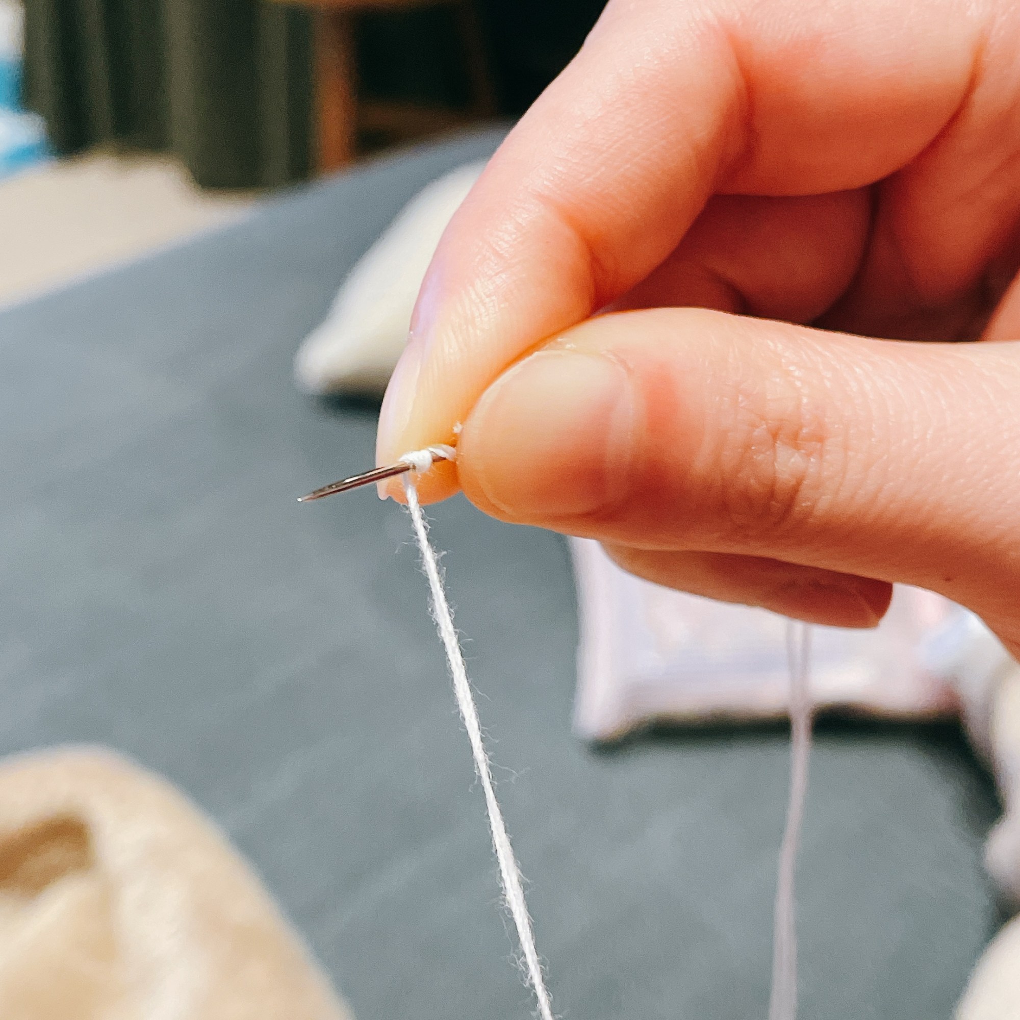 首先將線穿過針、拉齊後在尾端(繞三圈針)打結,