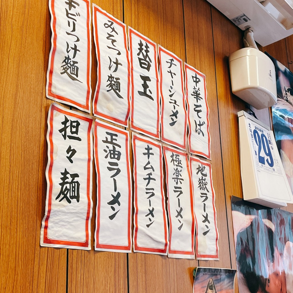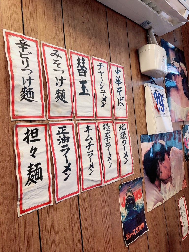 【中華そば】店舖內昭和懷舊氣氛濃厚,除了牆面上的手寫菜單、日本明星海報和日曆,卡帶收音機、古老的時鐘和風扇都展現老派復古風情。