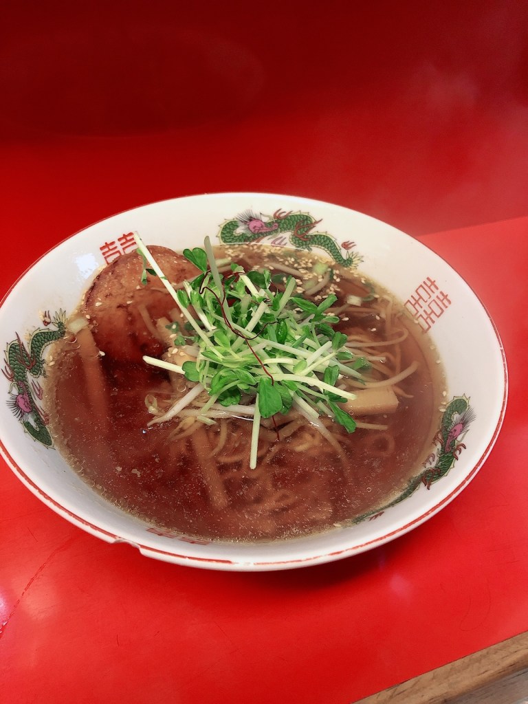 以素高湯、醬油、素沙茶調製的醬油風拉麵,配上脆脆爽口的筍乾和豆苗,麵湯淡雅卻不斷刺激食慾。