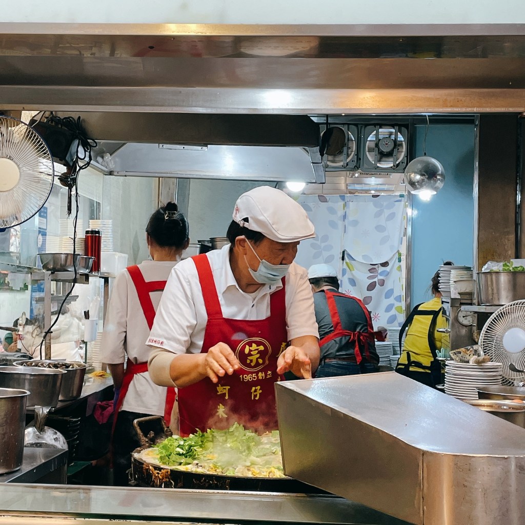 雞蛋、小白菜、新鮮的蚵仔、地瓜粉拌水,『唰- – -』影集中的賴老闆俐落翻動粉漿煎到微酥,工作檯外圍的自動輸送帶出現一份又一份乾爽的蚵仔煎,是值得靜心等候的美味。