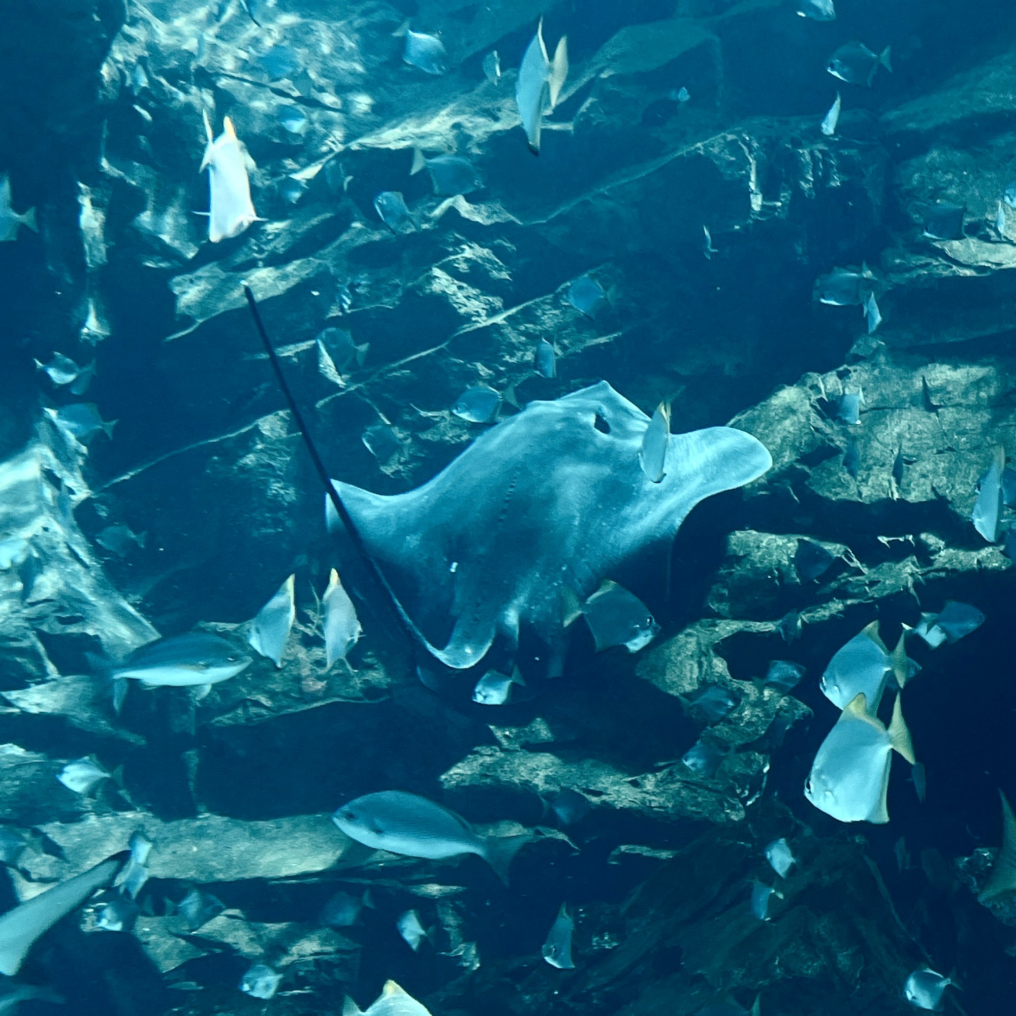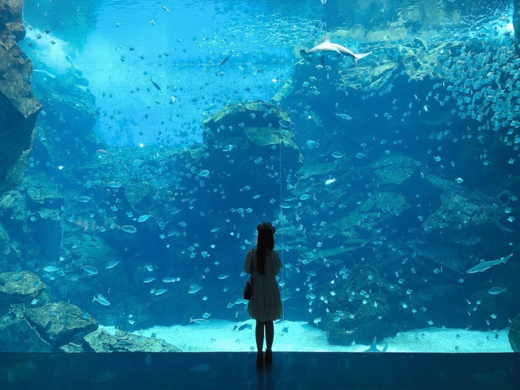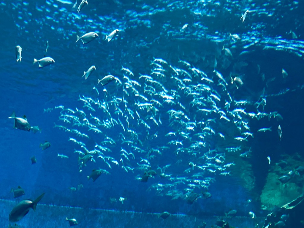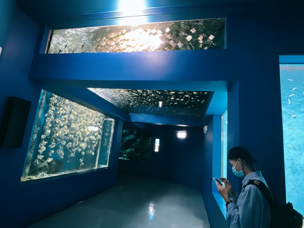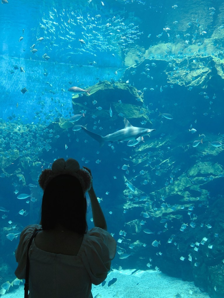 米飛喜歡靜靜站在水缸前看著亂中有序的點點魚群,夾雜鯊魚、雙髻鯊魚以及魟魚慢速水中滑行,波瀾壯闊的海底樣貌再次提醒人類的渺小。
