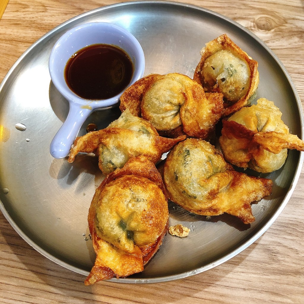 炸到酥脆的餛飩,內餡包著滿滿的臭豆腐和海帶芽,沾鹹甜的蒜蓉醬,是有趣的小點心。