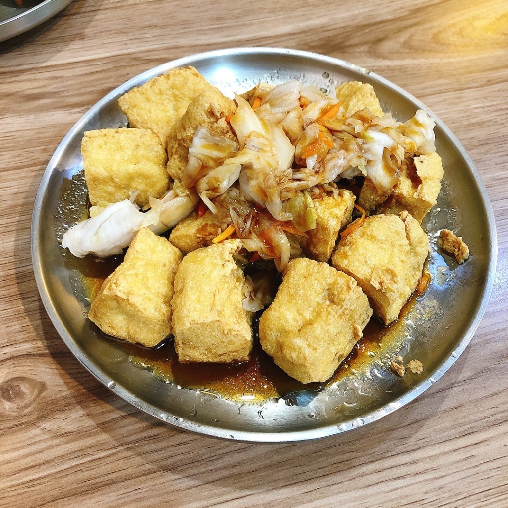 bite-size的小個頭臭豆腐,不會太臭,快速炸過後依舊保留豆腐的濕潤,淋上淡淡的蒜味醬油搭配台式酸甜泡菜,很適合這輩子第一次吃臭豆腐的初級吃貨挑戰!