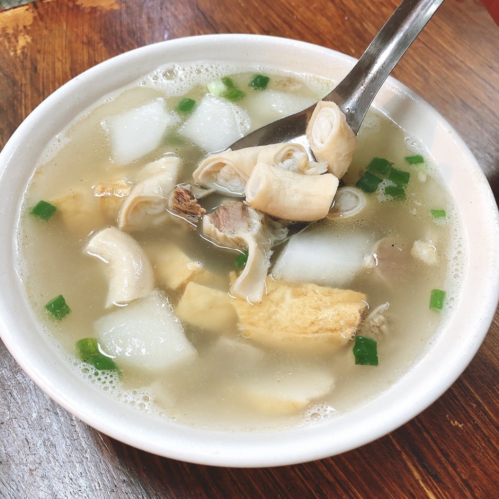 熬到雪白的大骨湯,配料有蘿蔔/小腸/米血糕/油豆腐/皇帝豆/甜不辣。
