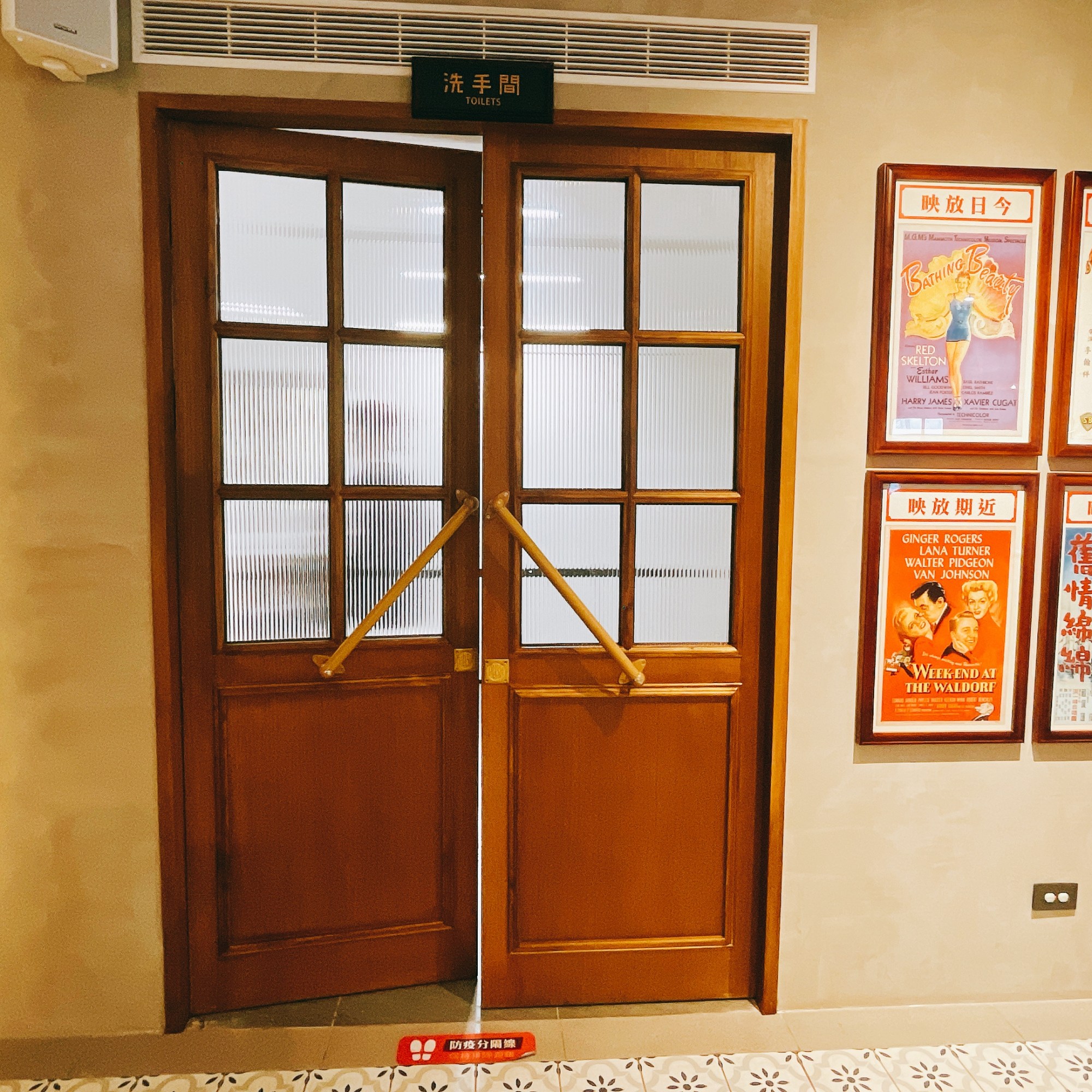 電影影廳廁所入口的舊式木框推門也樸質經典,牆面上裝飾著今天播放的電影和下期預告