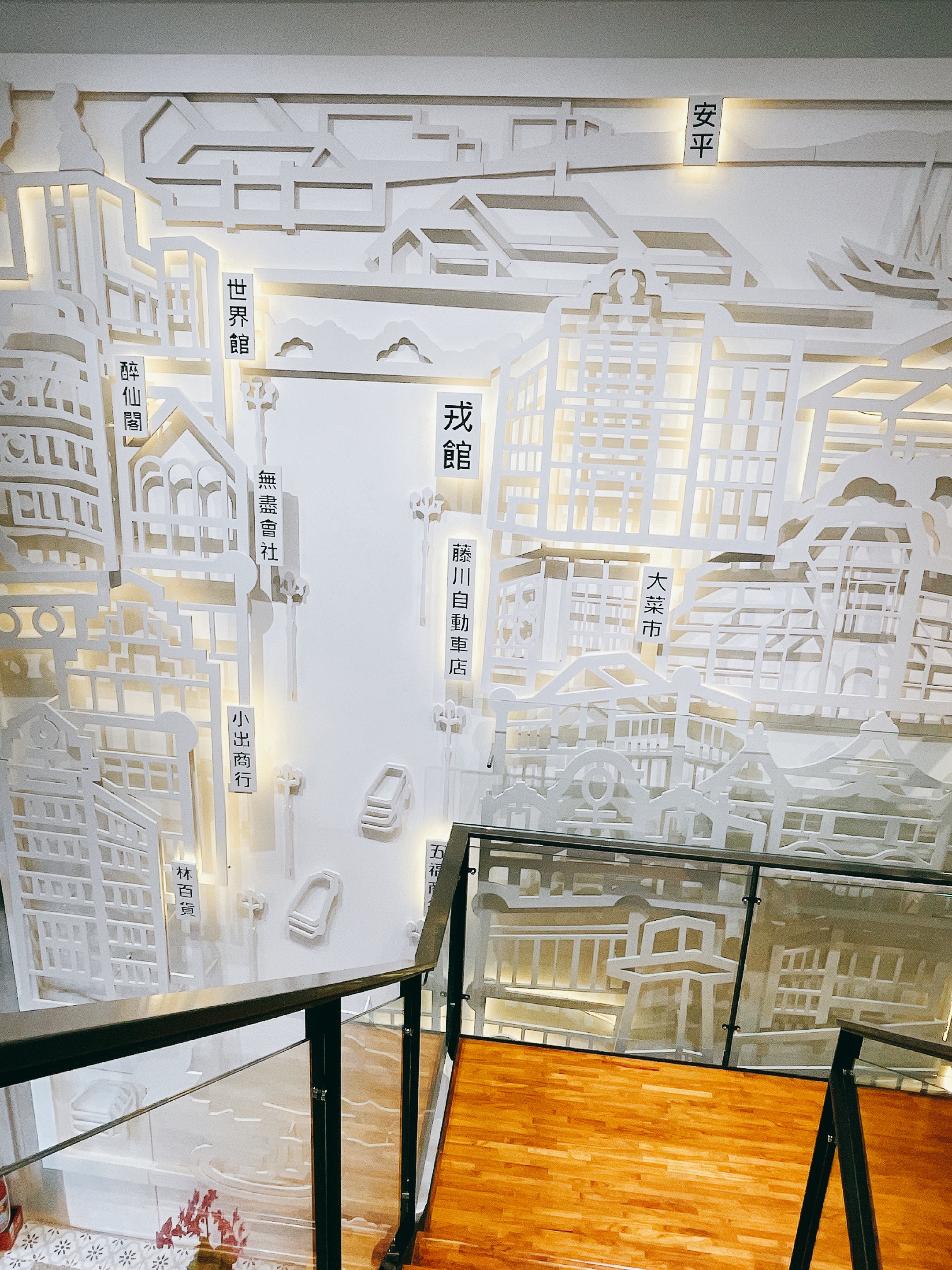 偌大白色古地圖佔滿【戎館】1樓~2樓的牆面,讓人一眼就掌握日治時期台南市區相對位置。鄰近的林百貨/小出商店、大菜市(台南西市場)等…都是當時台南『蛋黃區』人民吃喝玩樂的一日生活圈。