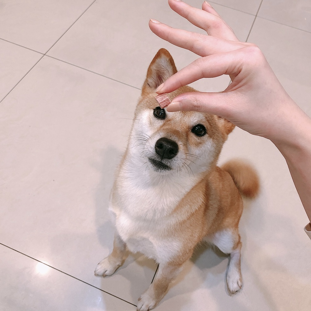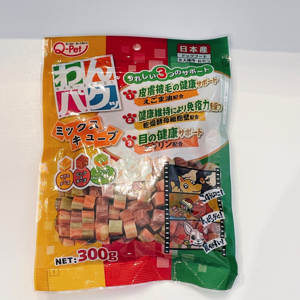 南瓜菠菜、牛肉起司、紅蘿蔔起司,米飛試吃一塊狗狗起司零食,這是人類不喜歡的味道,但家中柴柴超愛、聞到就興奮地轉圈圈。