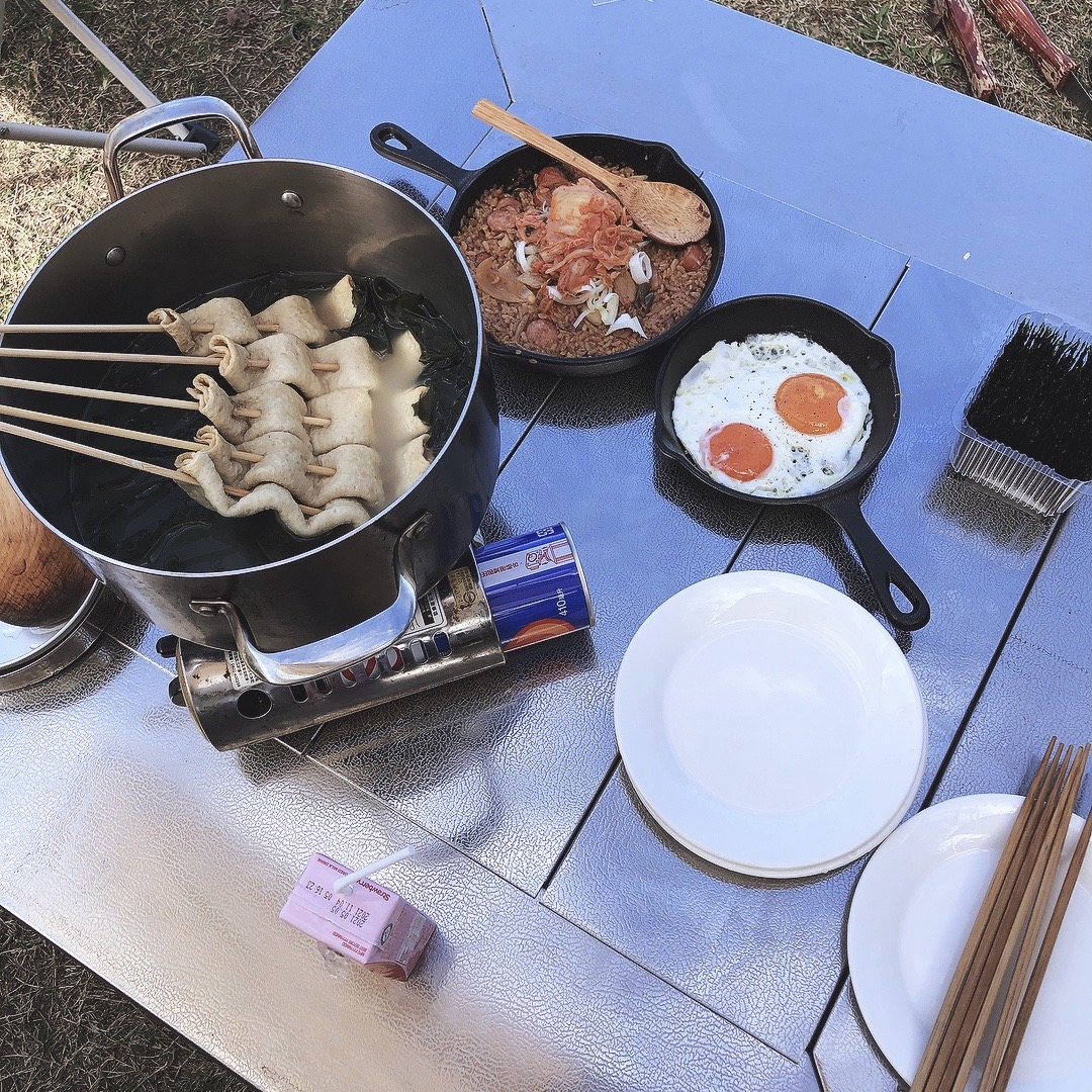 露營第二天恰好是半獸人先生的生日,高舉魚糕『碰串』取代乾杯祝福,綿延不斷的海帶象徵長壽;搭配太陽蛋和泡菜炒飯,兩天一夜露營慶生最後一餐超滿足!