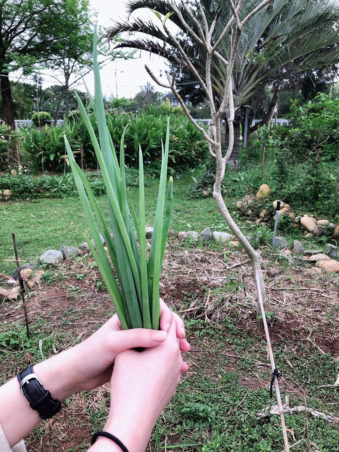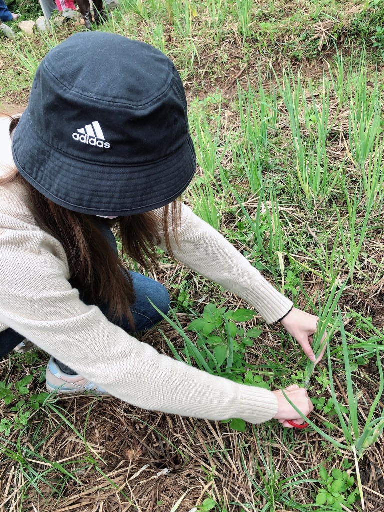 原本以為可以採摘玉米筍,熟知導覽人員告知「最近青黃不接收成欠佳只能摘蔥」每組人馬分配幾把剪刀、稍微說明蔥白和蔥綠的差異,就讓大家各自上田野採蔥。