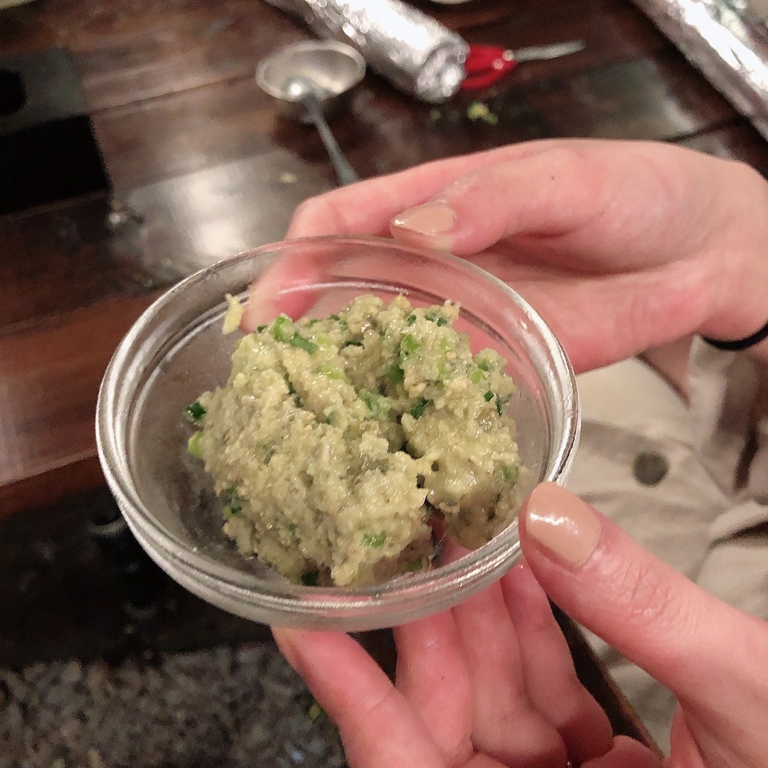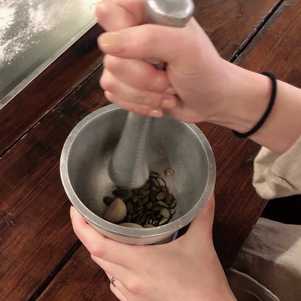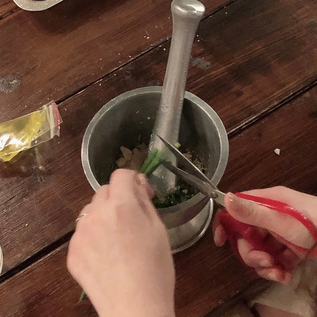 蒜頭和南瓜籽搗碎後,將韭菜剪成細碎並加入起司粉、橄欖油攪拌均勻