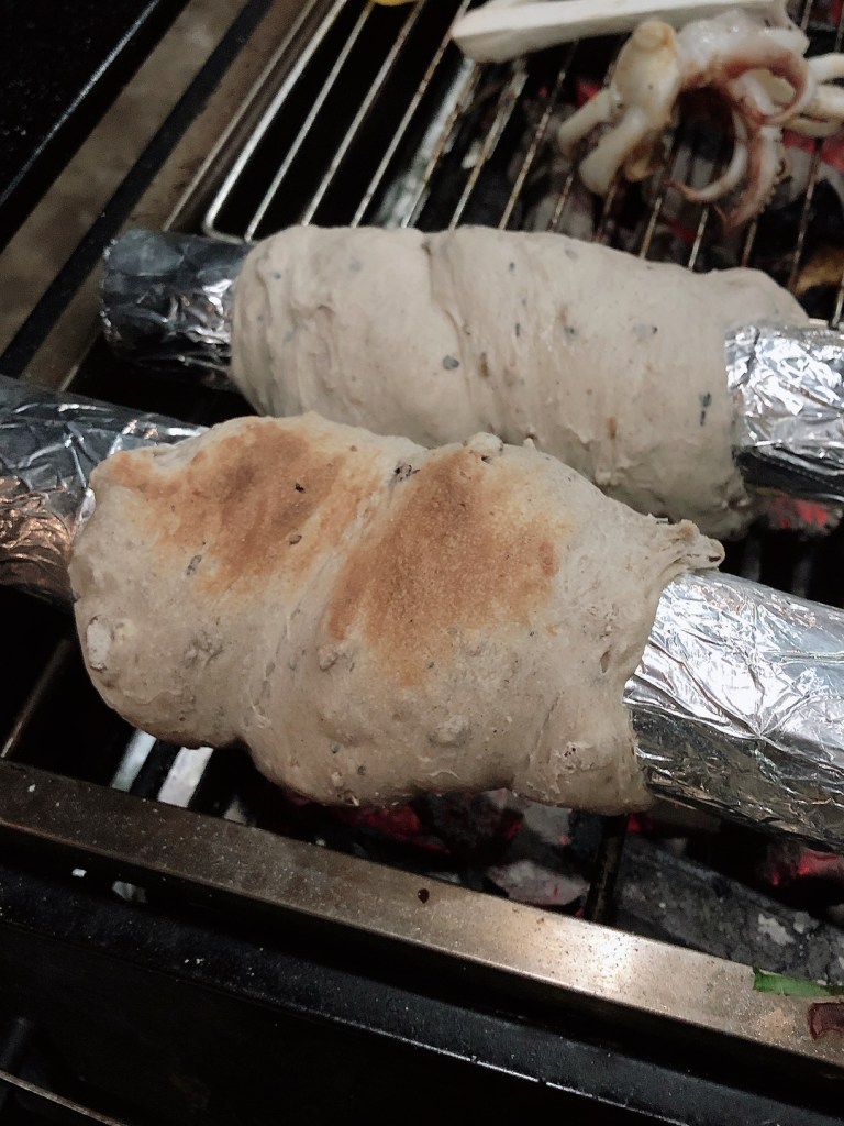 漫不經心的農遊體驗結束後,工作人員就會幫忙把燒好的木炭放到烤肉架上,可以邊烤邊等『麵包超人』轉檯來圈裡進行麵包教學。