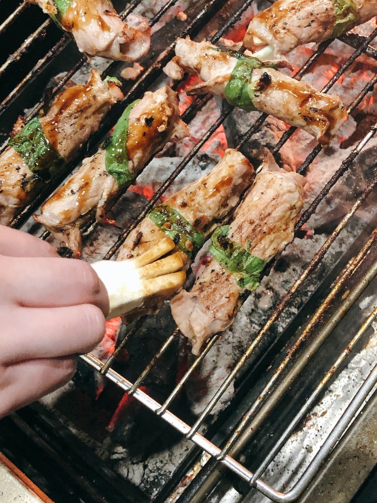 將蔥段/紅椒/青椒/杏鮑菇條鋪在梅花豬肉片上,輕輕捲起來並用一根青蔥捲起來,把蔥尾巴塞進纏繞處壓緊,將肉卷烤到上色後,再塗適量醬汁烤到肉散發香噴噴的誘人滋味就完成囉!