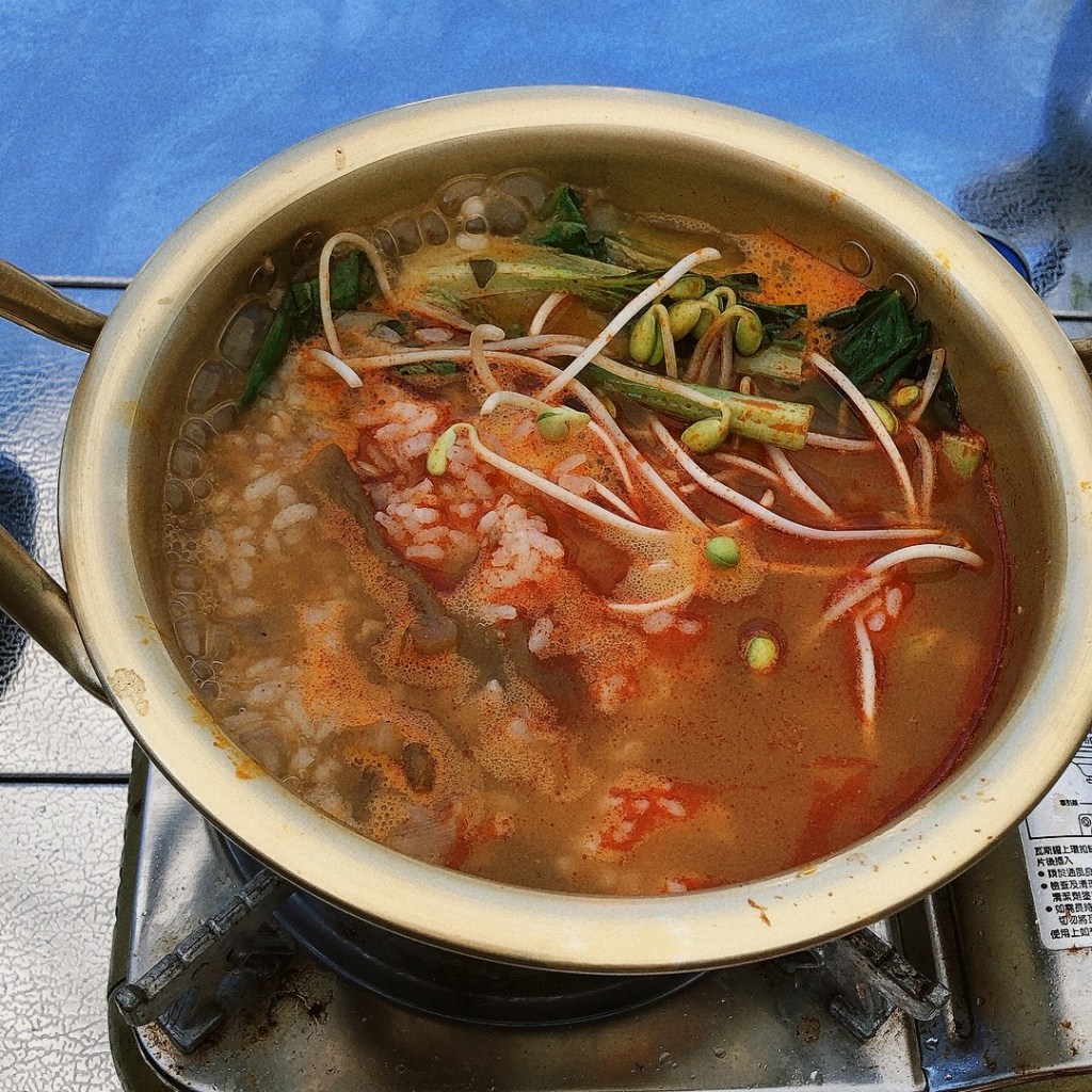 米飯吸飽微辣的牛肉湯汁,黃豆芽和青江菜提供爽脆口感讓湯頭略帶蔬菜美味,湯勺大口舀起湯飯送入嘴裡,燙口卻捨不得慢慢吃。配菜是兩顆漂亮的太陽蛋,搭配上前一晚剩下的泡菜/涼拌海帶芽,山上露營早餐怎可如此令人滿足?