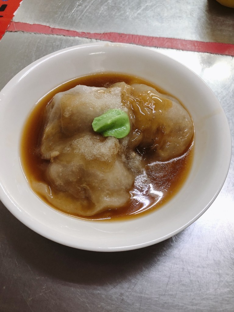 單吃肉圓的滋味相對樸實,不過一旦加入刺激性調味料適度攪和,竟能瞬間凸顯餡料的鮮美!柔軟的『肉圓皮』沾滿醬汁不斷刺激味蕾,最後以哇沙米嗆辣的回馬槍作結,個中滋味就由各位吃貨自己來體驗吧!