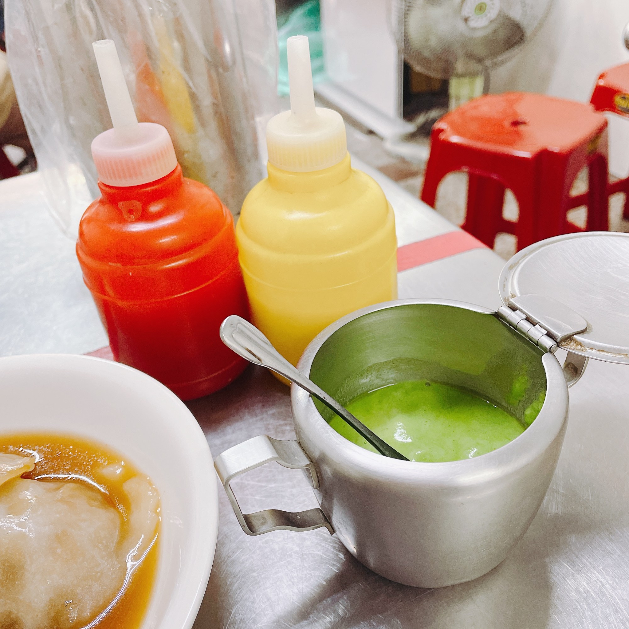 老闆從蒸籠裡仔細鏟起雪白的肉圓,澆上微甜醬油膏,每桌附有肉圓的靈魂伴侶(蒜泥、辣根醬、台式哇沙米)可依自己的喜好調整味道。