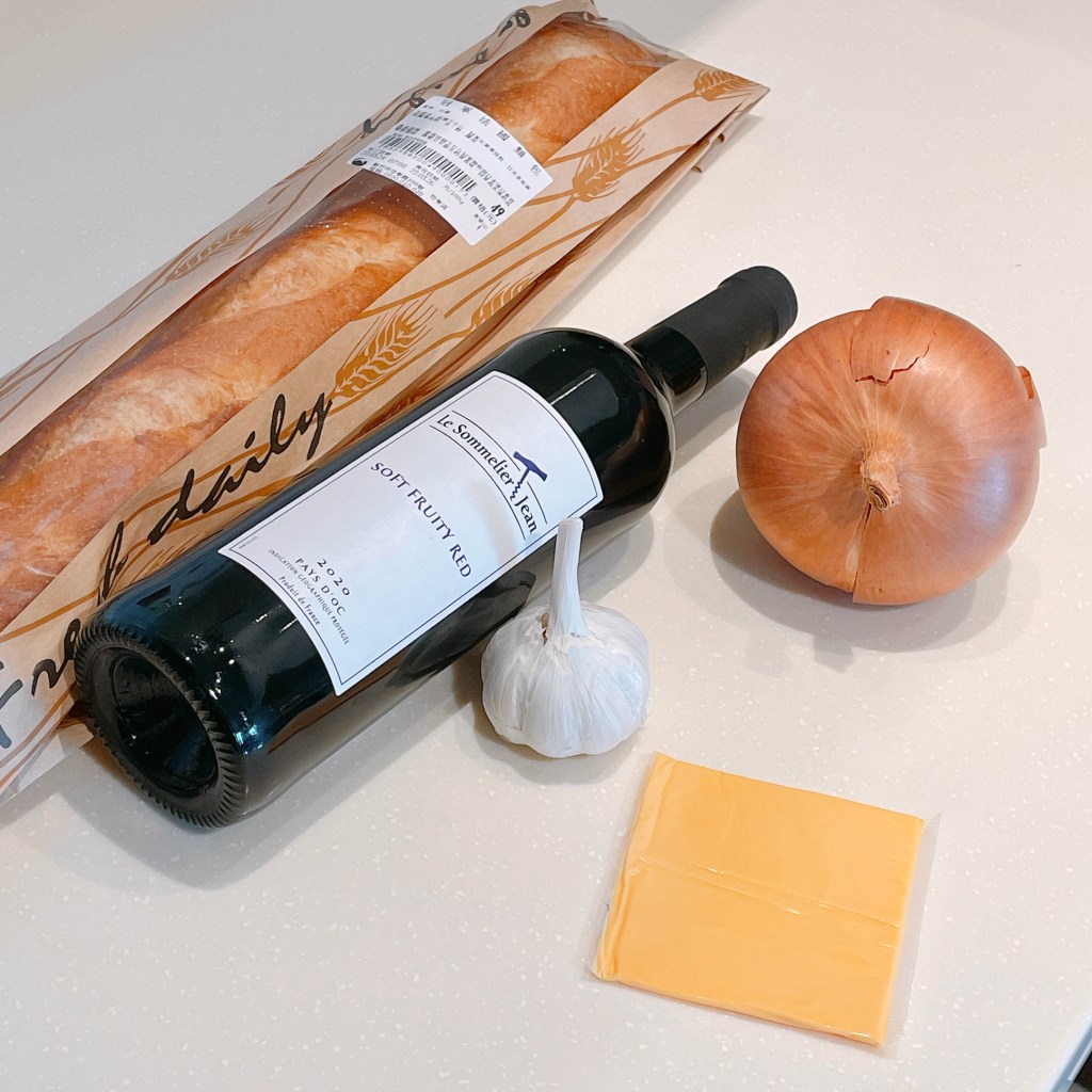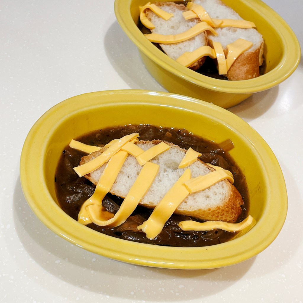 烤箱200度c 預熱10分鐘,在洋蔥湯上放長棍麵包(切片)和切達起司條(1片)放入烤箱烤3~5分鐘(或起司融化)就能華麗上桌囉!