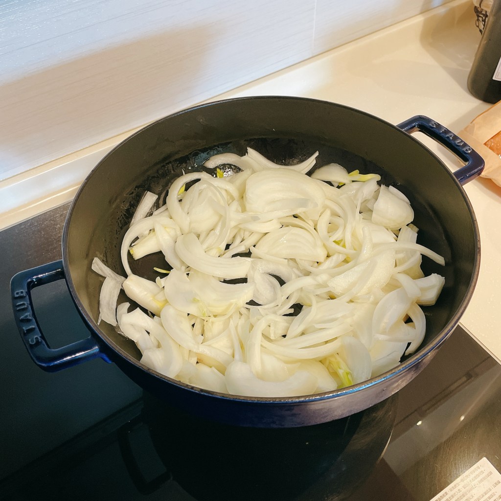 鑄鐵鍋加適量橄欖油加熱後,將洋蔥絲(500g)均勻拌炒至半透明,