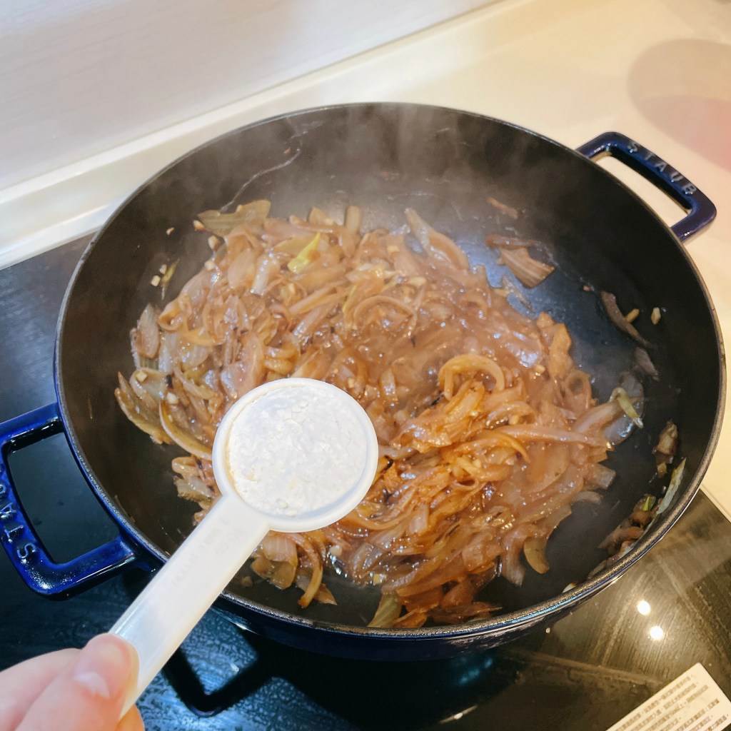 接著將中筋麵粉(1大匙)均勻灑在焦糖化的洋蔥上,快速翻炒不要讓麵粉結塊