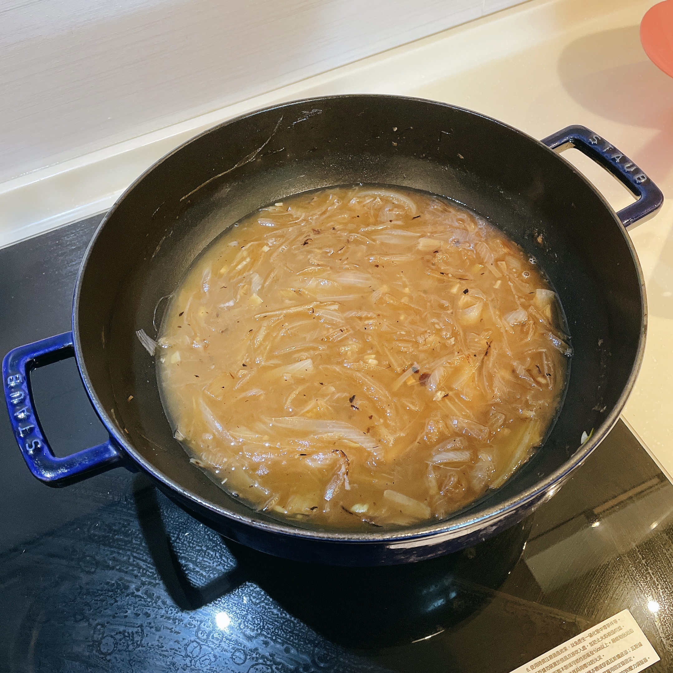 最後加入剩下的牛肉高湯(500ml)蓋上鑄鐵鍋鍋蓋、以中火煮10分鐘,再加鹽巴(2茶匙)調味,基礎的洋蔥清湯就完成囉!
