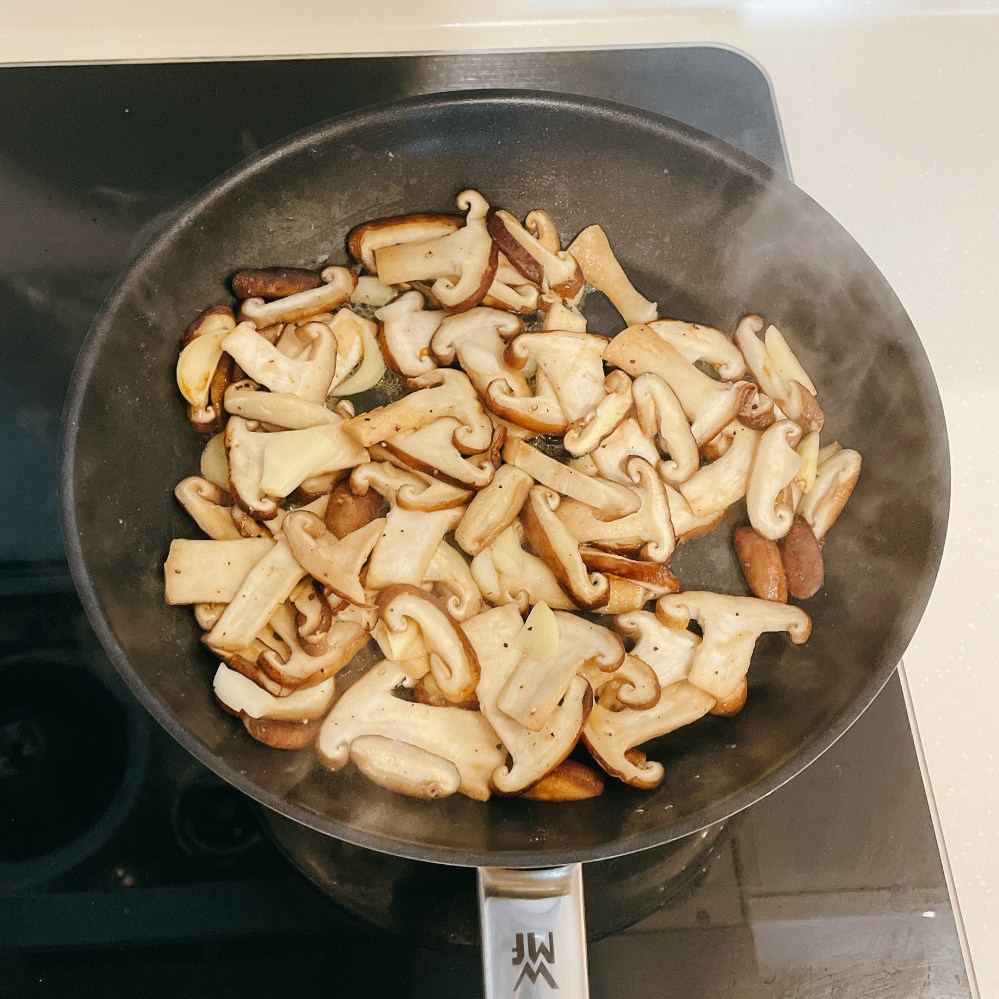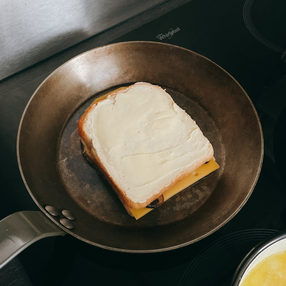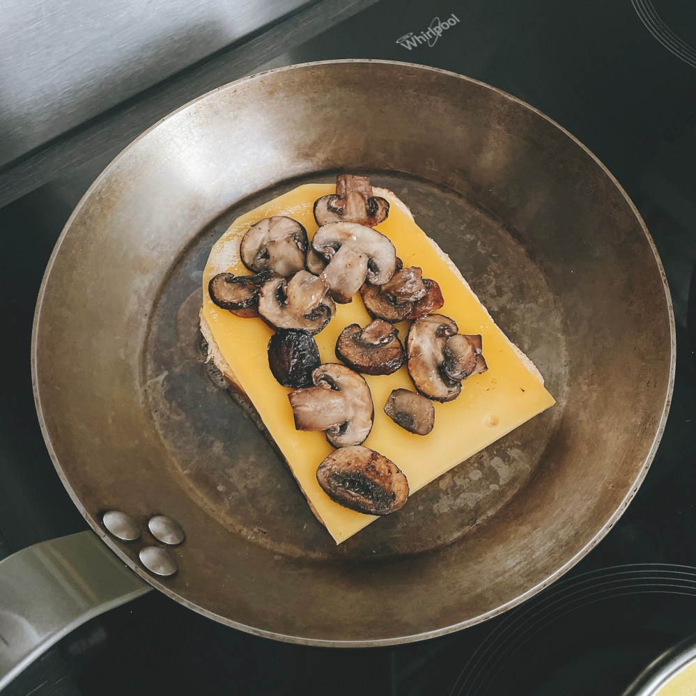 小火加熱le Buyer藍鐵鍋,放入一片吐司(有抹奶油那面朝下),在依序疊上Beemster jong belegen起司(1片)、油漬蘑菇(依個人喜好適量)、另一片吐司(有抹奶油那面朝上),