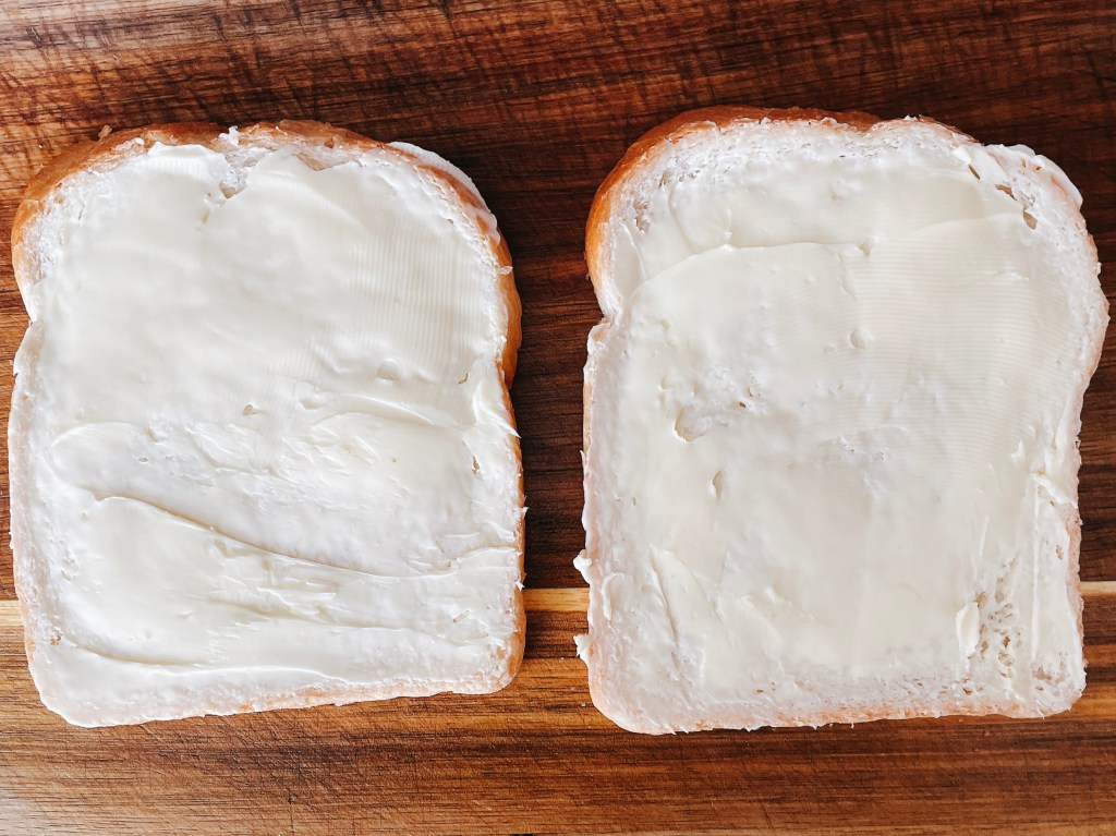 奶油(15-20g)在室溫放軟到手壓下去會軟掉的狀態,再用抹刀把兩片吐司的單面上厚厚抹一層,