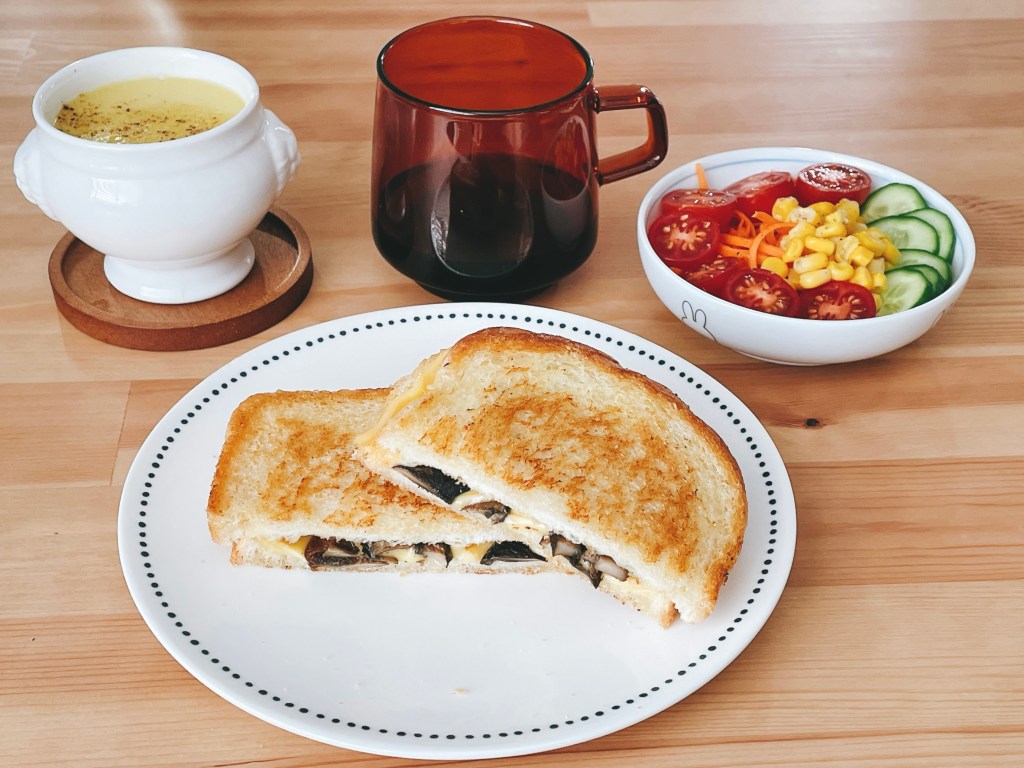 把煎好的【烤起司蘑菇三明治】對切,再快速弄一個玉米濃湯和沙拉,在家也能輕鬆享受網美咖啡廳般的美味早午餐喔!