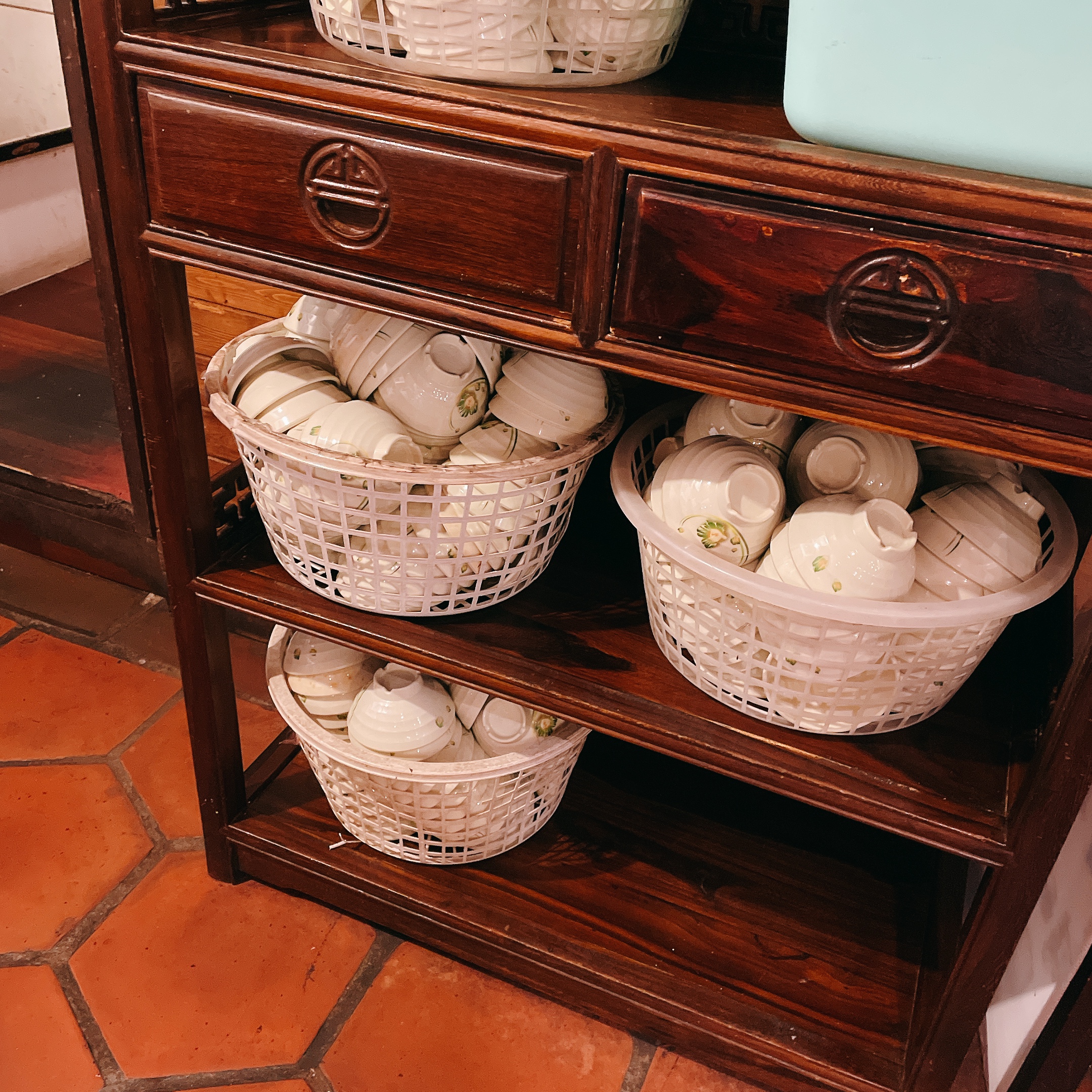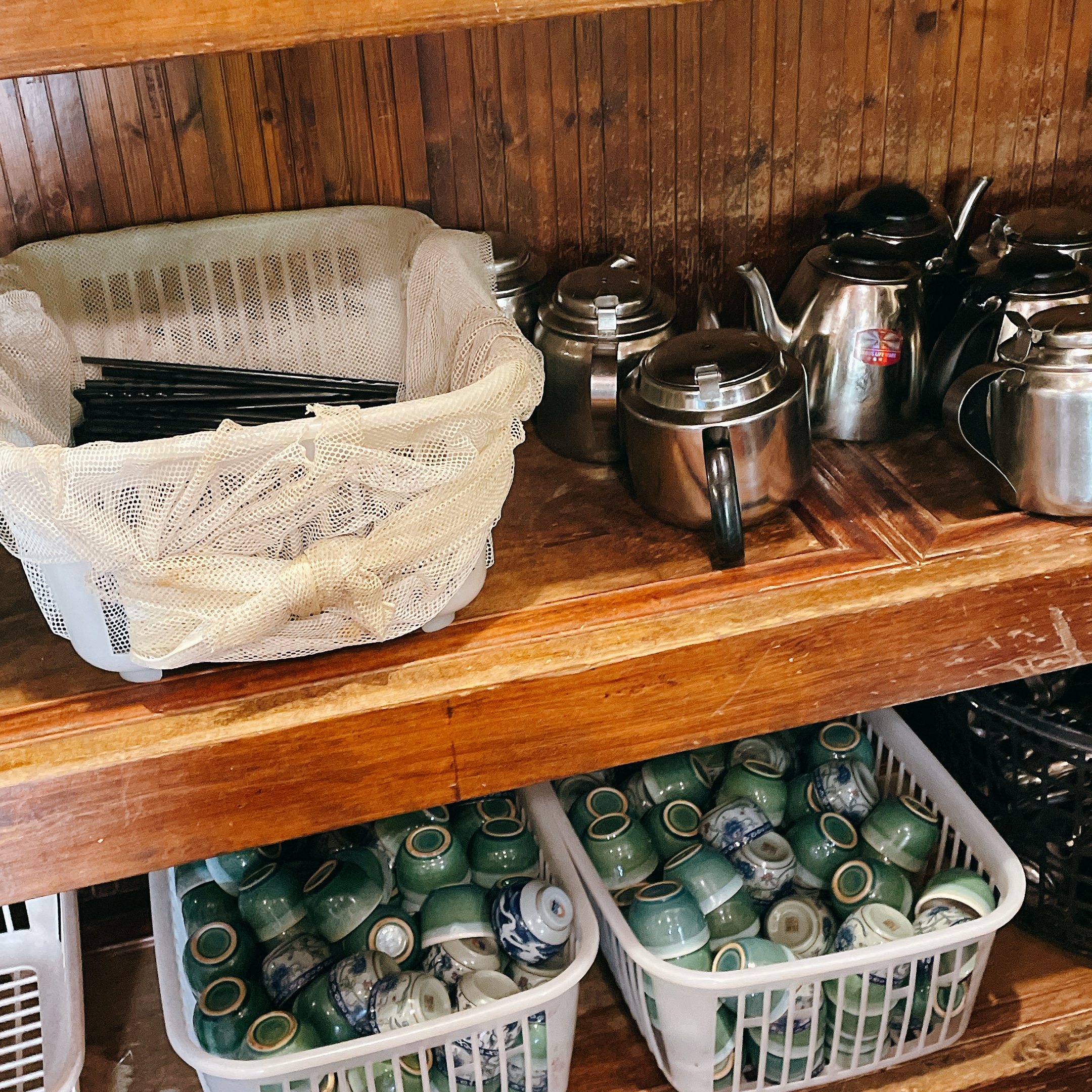 角落樸素的木質層架上有碗/筷子/茶壺/茶杯可自行取用;【潛園五行湯麵】就跟台灣大部分的快炒店一樣,白飯內用免費。