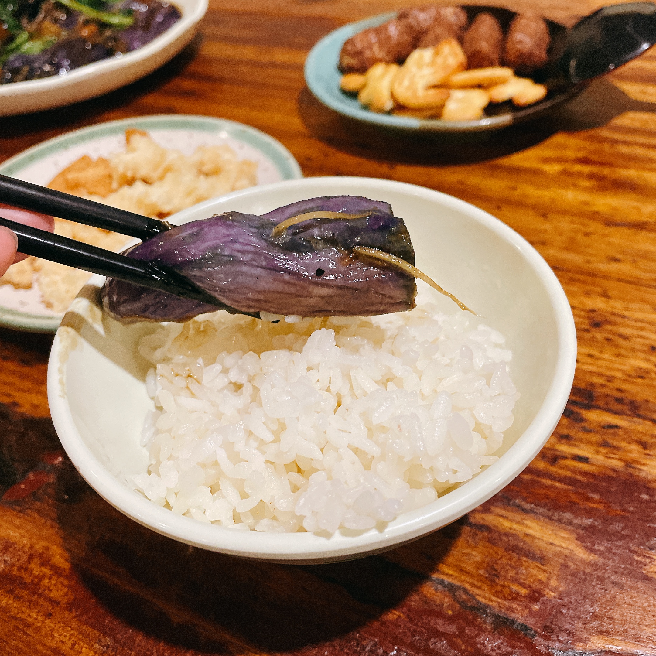 紅燒茄子以薑絲、醬油、豆瓣醬大火快炒後再撒上九層塔增添香氣,下飯卻不重鹹,是白飯小偷界的「雅痞」亞森羅蘋!